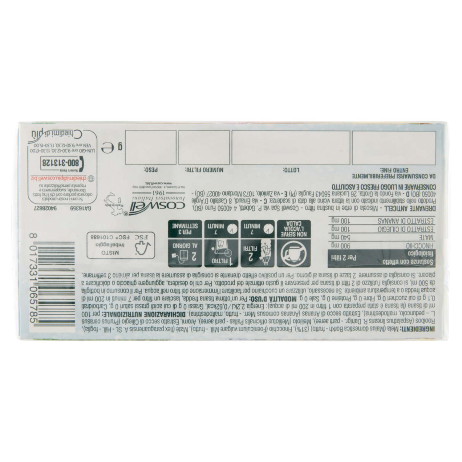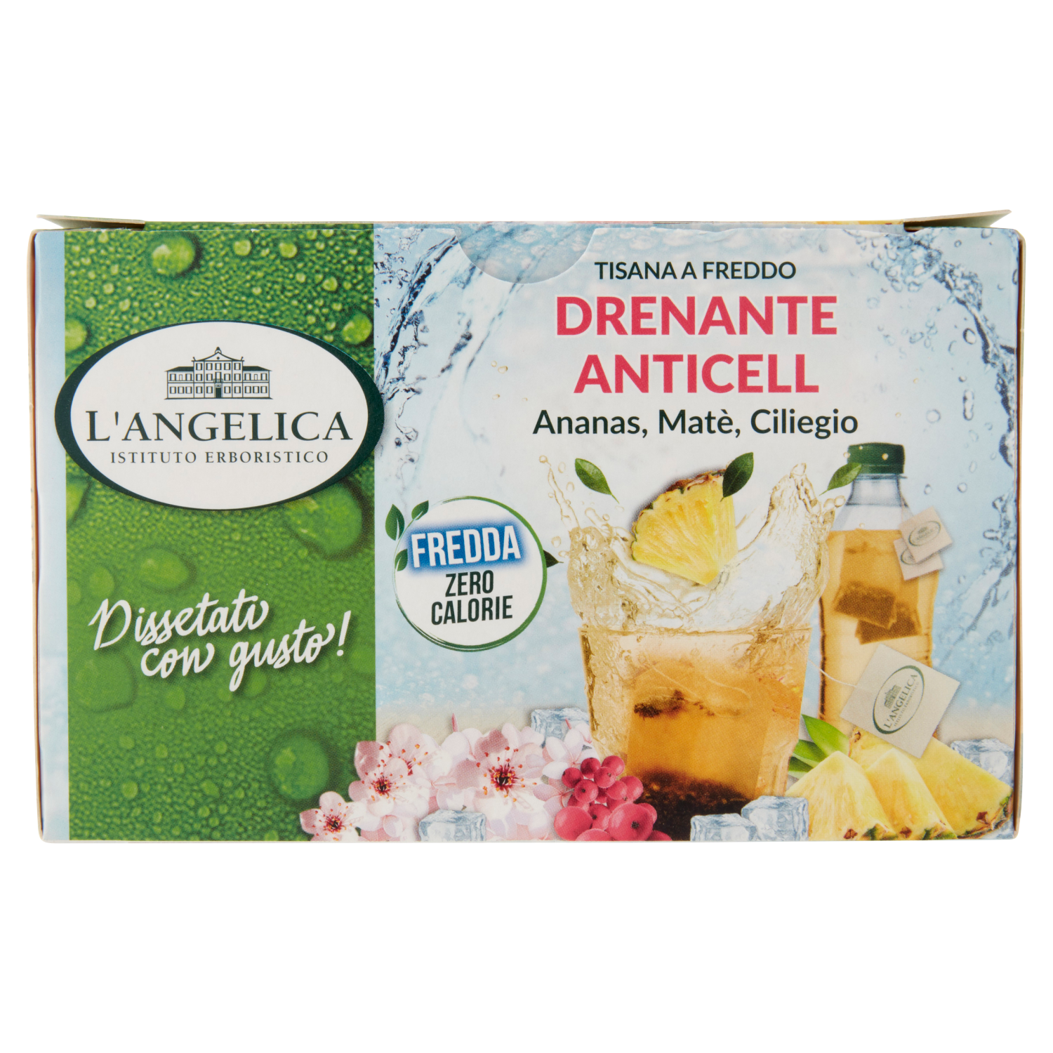 Drenante Anticell Finalmente una linea di tisane da infondere direttamente in Acqua Fredda! Goditi una pausa fresca e di gusto con questa tisana, prendendoti cura del tuo benessere. Le Tisane, insieme ad uno stile di vita sano ed una dieta varia ed equilibrata, sono il rimedio ideale per prendersi cura di sé. Nei periodi di vita sedentaria, scarsa attività fisica o alimentazione scorretta, quando hai bisogno di un bevanda drenante, rinfrescante e benefica per contrastare gambe gonfie o alterate da fastidiosi inestetismi. Arricchisci la tua Acqua con Finocchio, Ananas, Ciliegio per drenare i liquidi corporei; Matè e Mela per stimolare il metabolismo e limitare l'assorbimento dei nutrienti, favorendo l'equilibrio del peso corporeo. Scopri il profumo e il sapore intenso di Ananas e Pompelmo, per una vera pausa di piacere e benessere. Senza glutine - È adatto ai celiaci *Senza lattosio - *naturalmente privo di lattosio Vegetariani Vegani - È adatto a diete vegetariane e vegane
