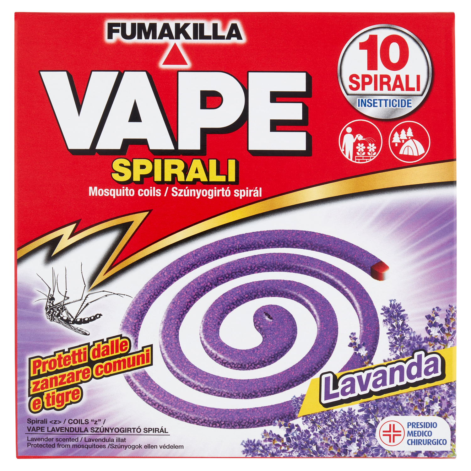 AVVERTENZE: Non è consentito il funzionamento in ambienti chiusi. Usare solo in ambienti aperti e semiaperti(verande, balconi, ecc.). Non ingerire Non respirare i fumi. È sconsigliata l'esposizione continua a persone sensibili (bambini, asmatici, ecc.). Conservare lontano da alimenti, mangimi e da bevande. ATTENZIONE Spirali "Z" INDICAZIONI DI PERICOLO: Tossico per gli organismi acquatici con effetti di lunga durata. CONSIGLI DI PRUDENZA: tenere fuori dalla portata dei bambini. Non mangiare, né bere, né fumare durante l'uso. Non disperdere nell'ambiente. Raccogliere il materiale fuoriuscito. Smaltire il prodotto/recipiente in conformità alla regolamentazione locale. Contiene: 5-chloro-2methyl-4-isothiazolin-3-one and 2-methyl-2H-isothiazolin-3-one (3:1); Metil Violet (basic 2B). Può provocare una reazione allergica. Presidio Medico Chirurgico Reg. n. 20297 del Ministero della Salute.
