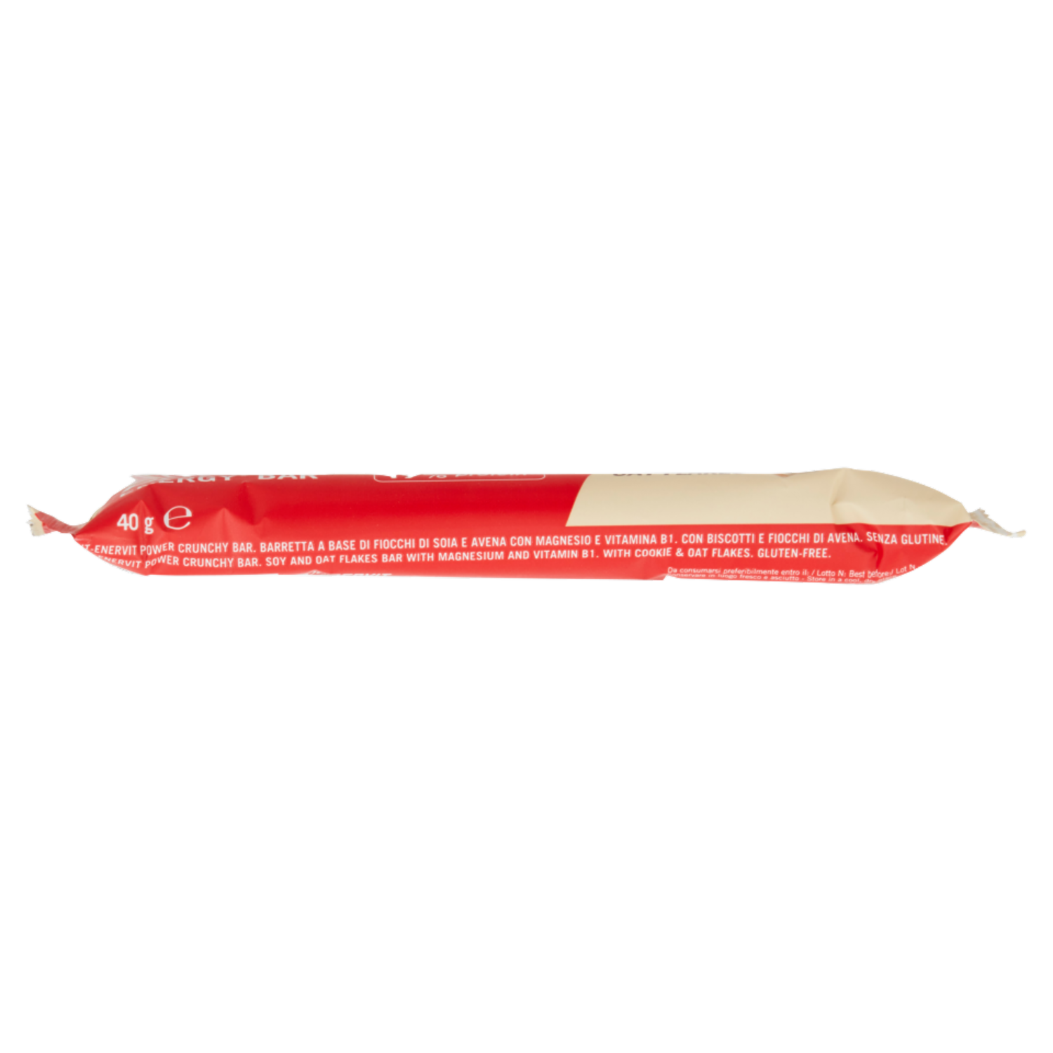 Enervit Power Crunchy Bar. Barretta a base di fiocchi di soia e avena con magnesio e vitamina B1. Con biscotti e fiocchi di avena. Senza glutine