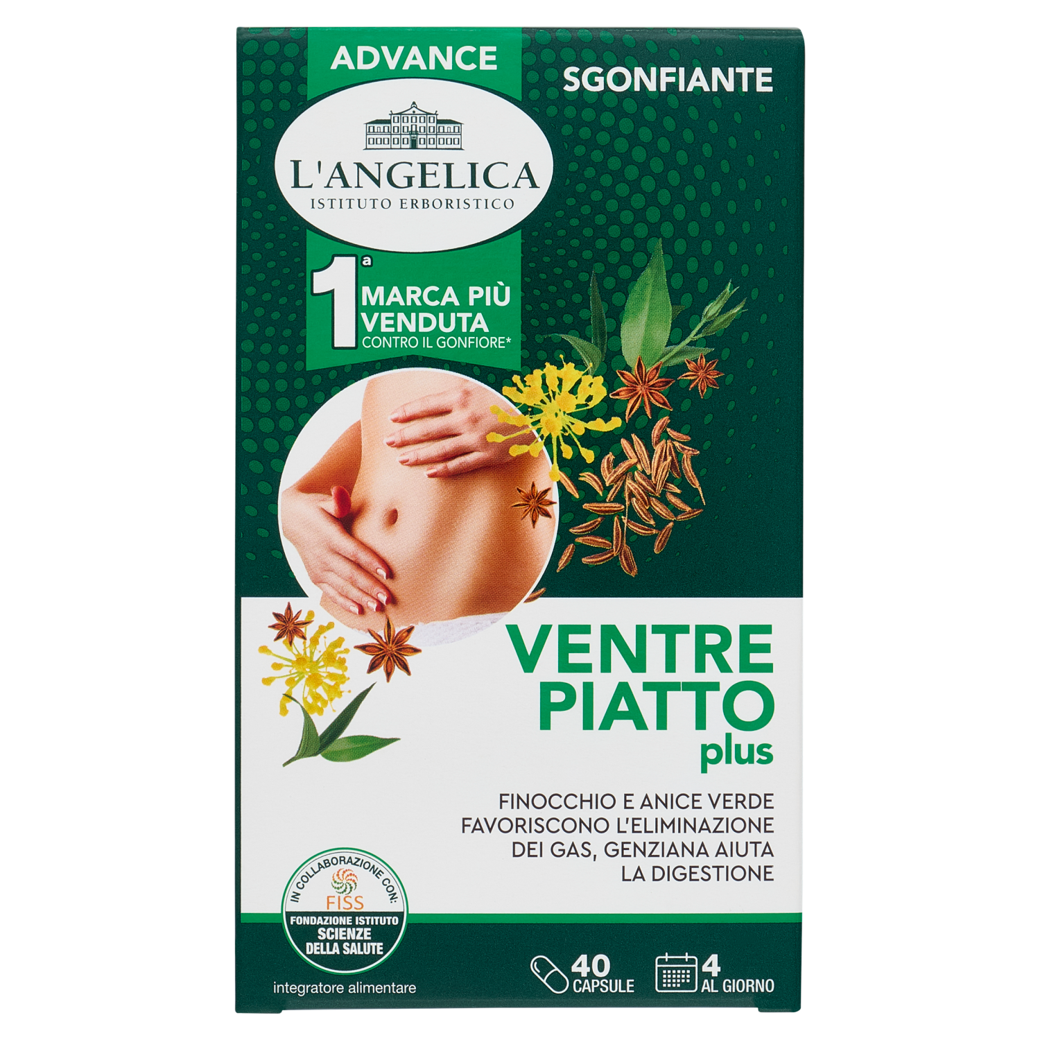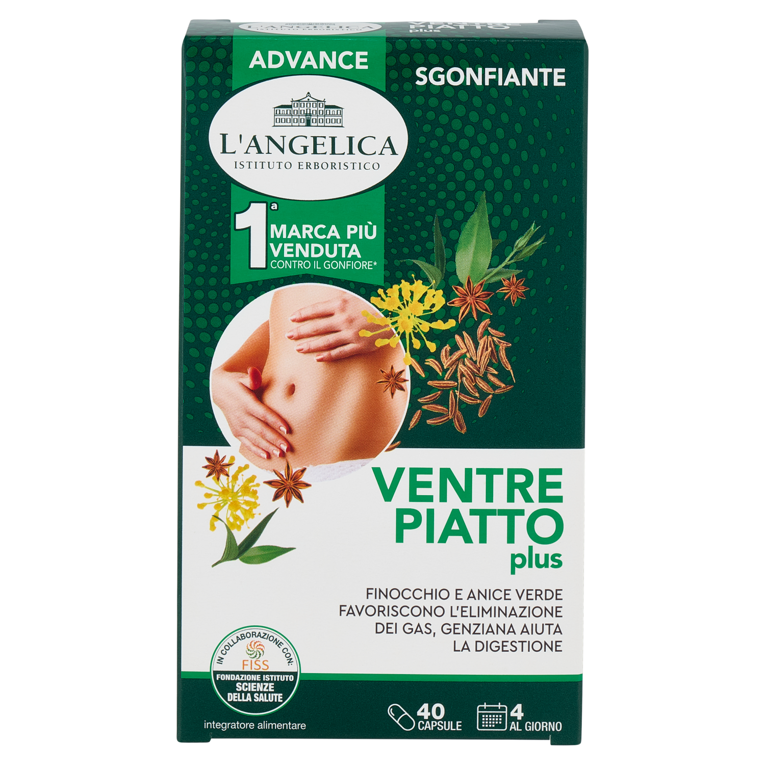 Ventre Piatto plus È l'integratore di L'Angelica a base di Anice Verde, Finocchio e Carvi utili quando ci si sente gonfi ed appesantiti, favoriscono la digestione e stimolano il transito intestinale. La formula è arricchita con Rabarbaro. L'Angelica Advance - Formula: Anice Verde, Finocchio, Carvi Funzione digestiva. Regolare motilità gastrointestinale ed eliminazione dei gas Rabarbaro (titolato in Reina) Regolarità del transito intestinale. Funzione digestiva **Estratti Titolati: L'Angelica seleziona e miscela solo gli ingredienti migliori, caratterizzati da quantità precise e costanti di principi attivi in Ogni Singola Dose, combinati per un'ottimale azione Sinergica. Non contiene conservanti, aromi artificiali, dolcificanti artificiali. *Senza lattosio - *naturalmente privo di lattosio Vegetariani Vegani - È adatto a diete vegetariane e vegane