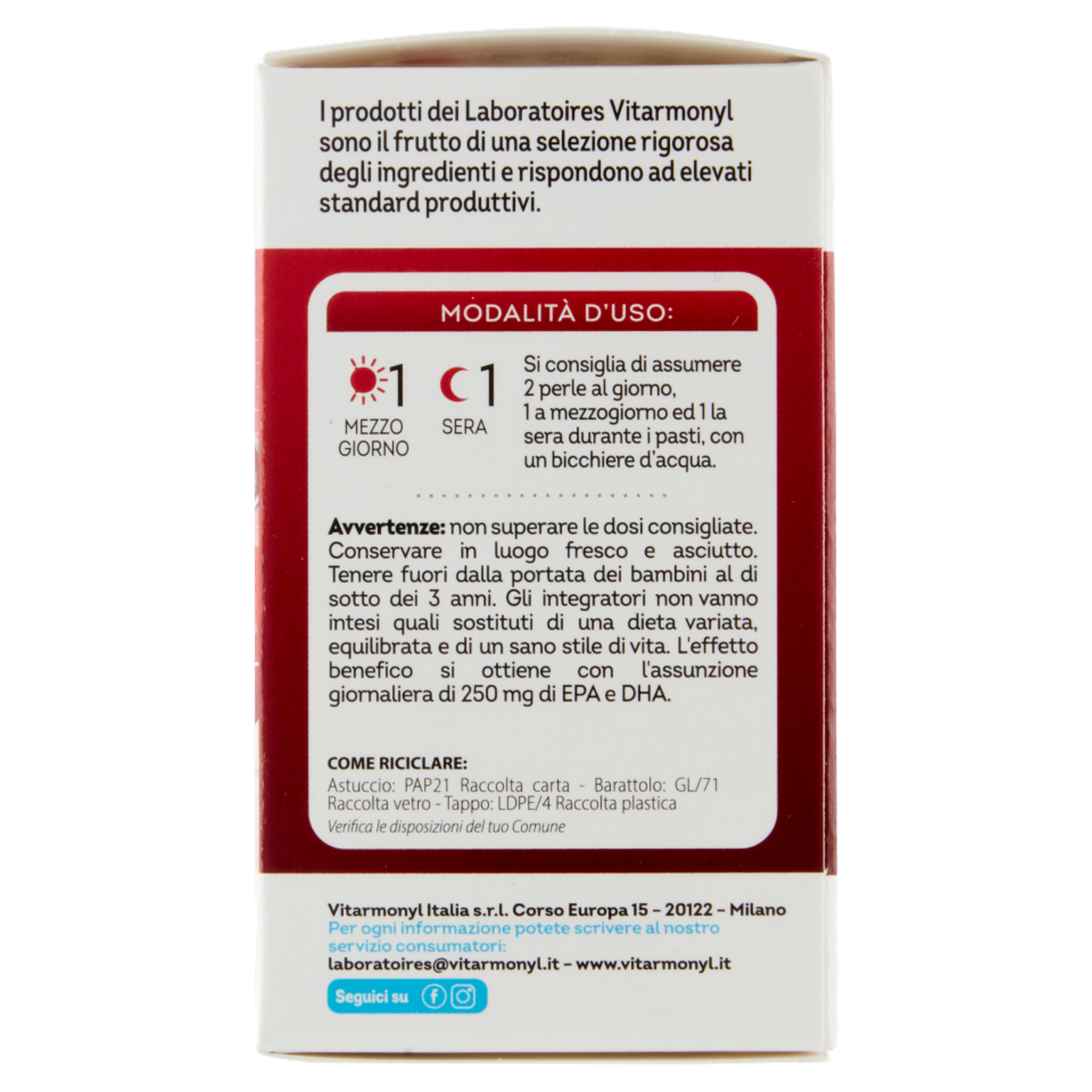 Avvertenze: non superare le dosi consigliate. Conservare in luogo fresco e asciutto. Tenere fuori dalla portata dei bambini al di sotto dei 3 anni. Gli integratori non vanno intesi quali sostituti di una dieta variata, equilibrata e di un sano stile di vita. L'effetto benefico si ottiene con l'assunzione giornaliera di 250 mg di EPA e DHA.