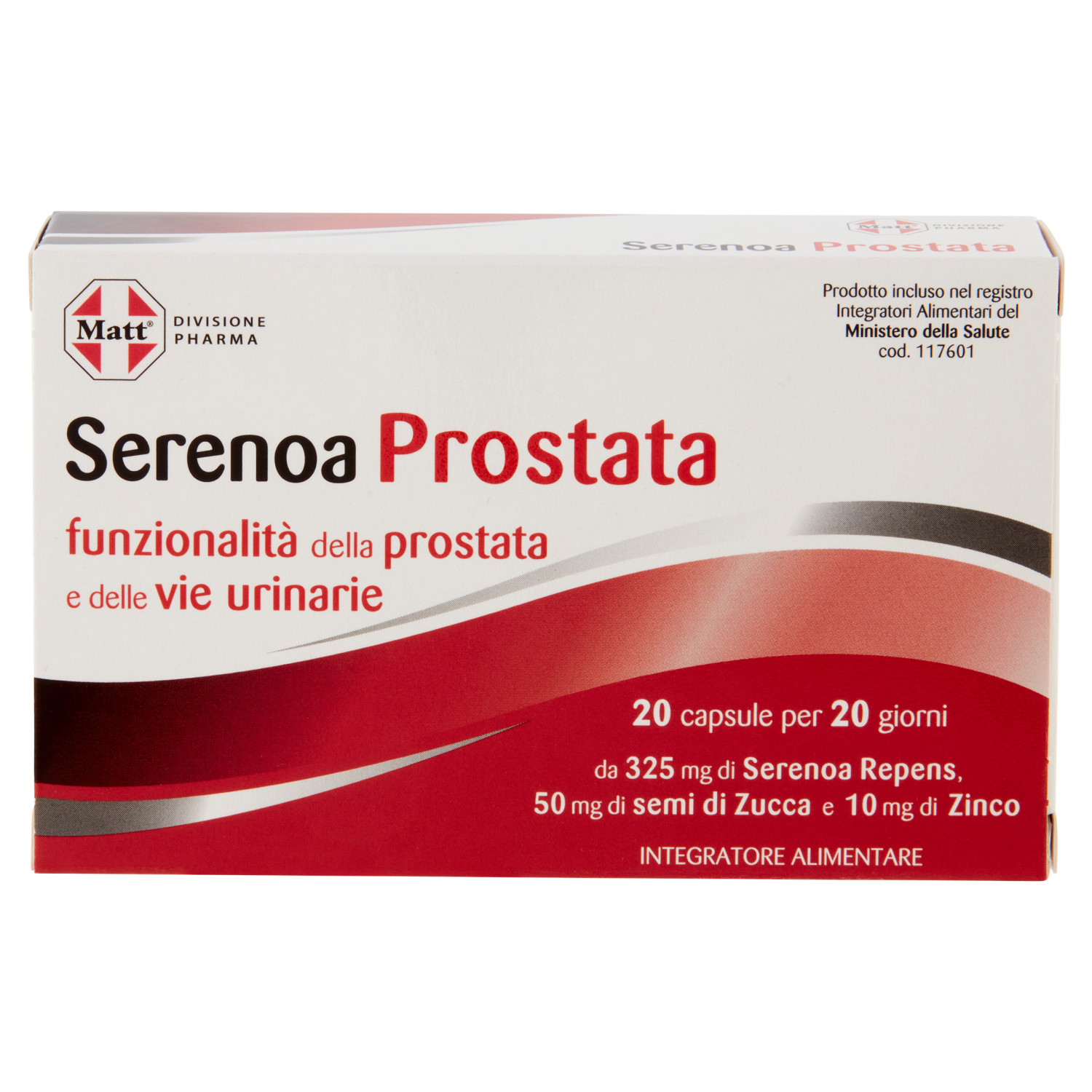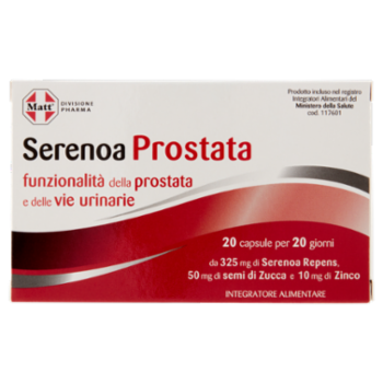 Serenoa Prostata è un integratore alimentare a base di Serenoa repens, Semi di Zucca e Zinco. La Serenoa repens e i Semi di Zucca favoriscono sinergicamente la funzionalità della prostata e delle vie urinarie. Lo Zinco contribuisce al mantenimento di normali livelli di testosterone nel sangue e alla normale fertilità e riproduzione. Ogni capsula contiene 325 mg di Serenoa Repens e 50 mg di Semi di Zucca