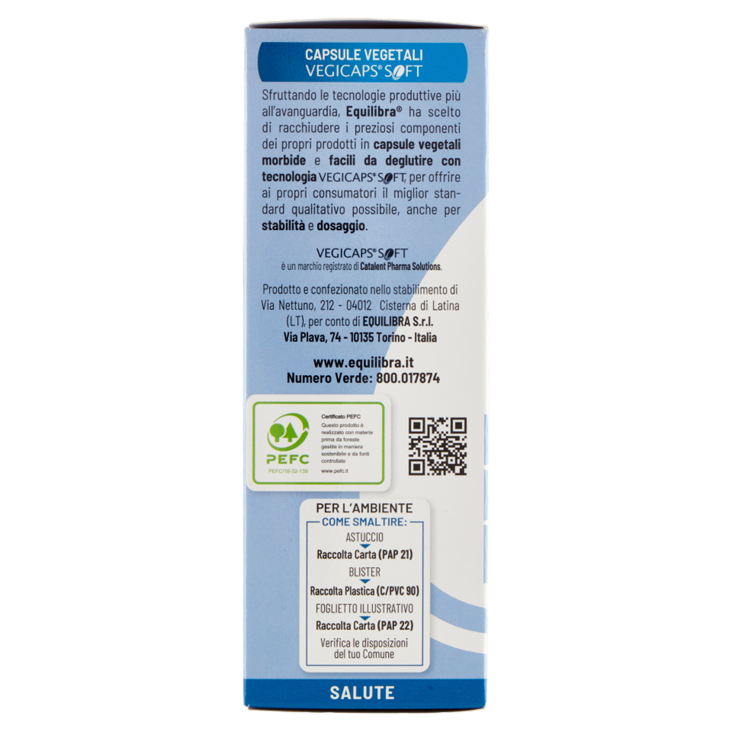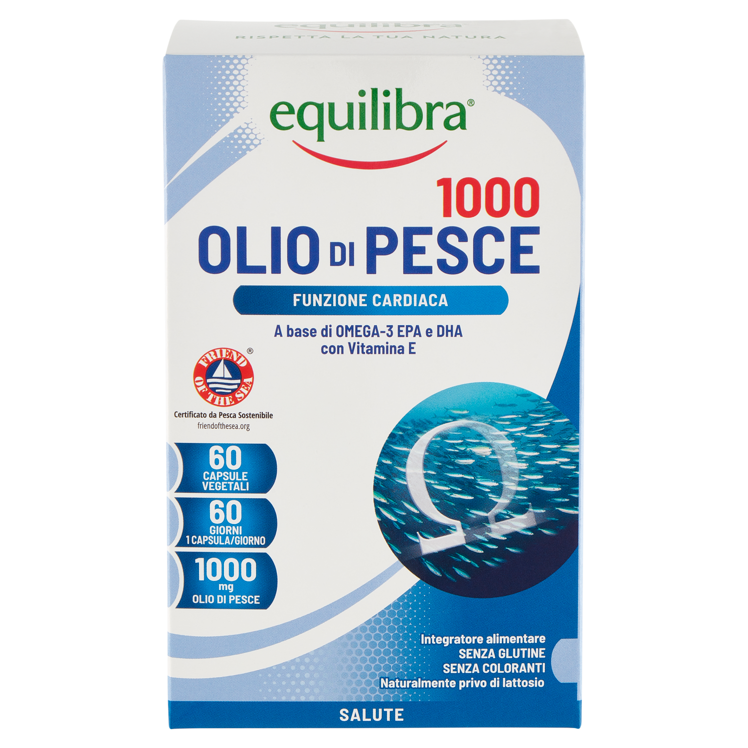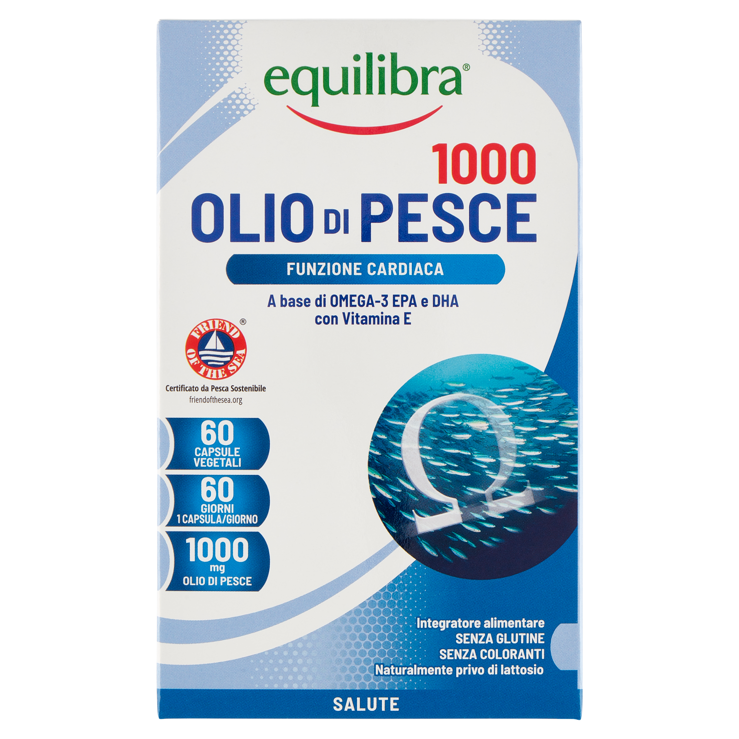 Olio di pesce 1000 Funzione cardiaca Olio di Pesce 1000 Equilibra è un integratore alimentare di acidi grassi polinsaturi della serie Omega-3 EPA e DHA, con Vitamina E. L'EPA e il DHA contribuiscono alla normale funzione cardiaca. L'effetto benefico si raggiunge con l'assunzione giornaliera di 250 mg di EPA e di DHA (1 capsula vegetale). Il DHA contribuisce inoltre alla normale funzionalità cerebrale e al mantenimento della normale capacità visiva. L'effetto benefico si raggiunge con l'assunzione giornaliera di 250 mg di DHA (2 capsule vegetali). Il prodotto contiene inoltre la Vitamina E che contribuisce alla protezione delle cellule dallo stress ossidativo. Omega-3 L'olio di pesce è ricco in acidi grassi polinsaturi della serie Omega-3, tra cui i più importanti sono l'EPA e il DHA. Gli Omega-3 sono acidi grassi essenziali la cui assunzione attraverso una dieta ed equilibrata è importante per il buon funzionamento del nostro organismo. Capsule vegetali Vegicaps Soft Sfruttando le tecnologie produttive più all'avanguardia, Equilibra ha scelto di racchiudere i preziosi componenti dei propri prodotti in capsule vegetali morbide e facili da deglutire con tecnologia Vegicaps Soft, per offrire ai propri consumatori il miglior standard qualitativo possibile, anche per stabilità e dosaggio.