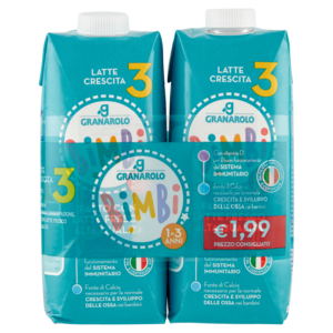 Nell'ambito di un'alimentazione varia ed equilibrata e uno stile di vita sano, il Latte Crescita 3 Granarolo è specificamente indicato per i bambini da 1 a 3 anni, salvo diverso parere del Pediatra. Il latte crescita 3 più venduto in Italia** **Fonte: dati IRI mercato Italia Latte Crescita 2020 - vai su www.granarolo.it