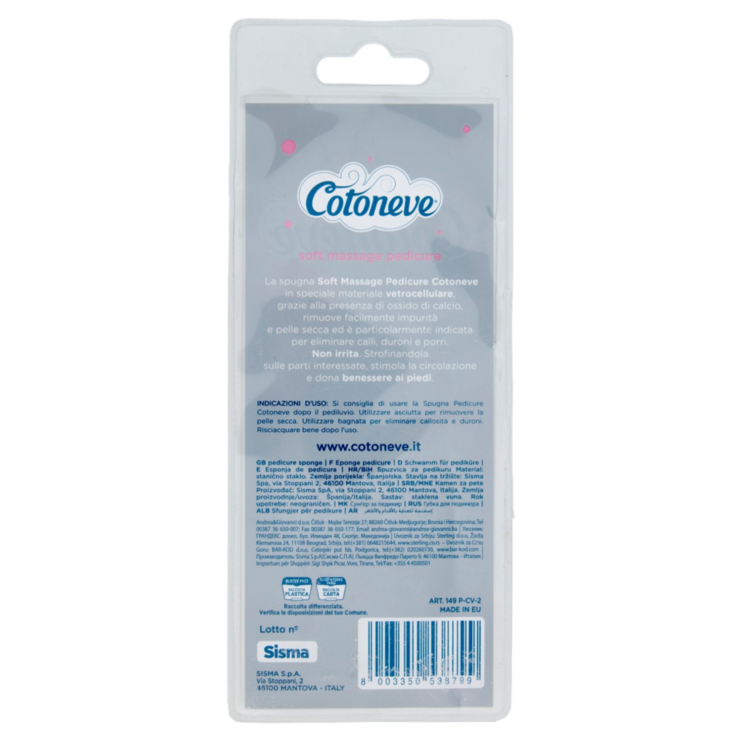 La spugna Soft Massage Pedicure Cotoneve in speciale materiale vetrocellulare, grazie alla presenza di ossido di calcio, rimuove facilmente impurità e pelle secca ed è particolarmente indicata per eliminare calli, duroni e porri. Non irrita. Strofinandola sulle parti interessate, stimola la circolazione e dona benessere ai piedi.