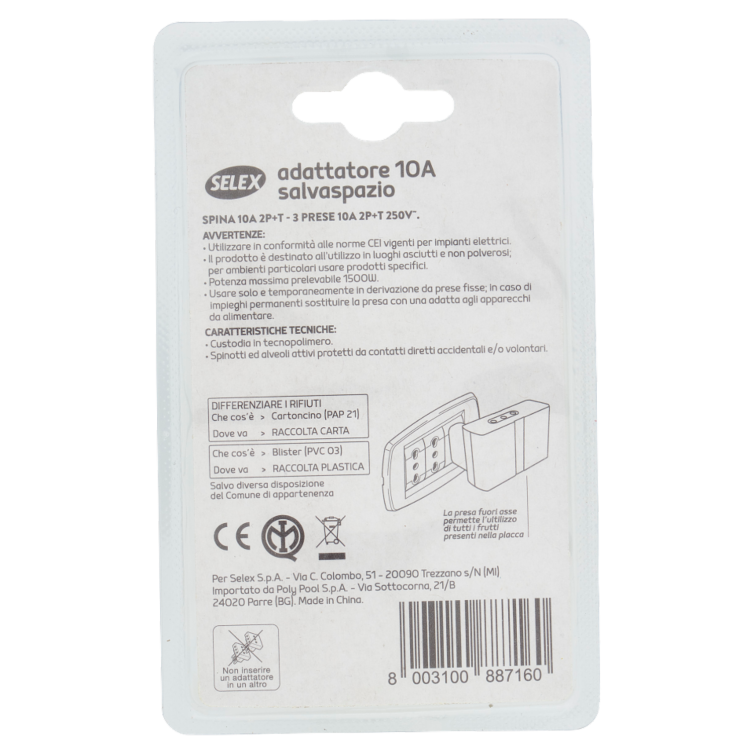 AVVERTENZE: - Utilizzare in conformità alle norme CEI vigenti per impianti elettrici. - Il prodotto è destinato all'utilizzo in luoghi asciutti e non polverosi; per ambienti particolari usare prodotti specifici. - Potenza massima prelevabile 1500W. - Usare solo e temporaneamente in derivazione da prese fisse; in caso di impieghi permanenti sostituire la presa con una adatta agli apparecchi da alimentare. Non inserire un adattatore in un altro