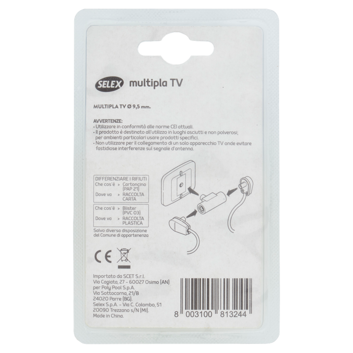 AVVERTENZE: - Utilizzare in conformità alle norme CEI attuali. - Il prodotto è destinato all'utilizzo in luoghi asciutti e non polverosi; per ambienti particolari usare prodotti specifici. - Non utilizzare per il collegamento di un solo apparecchio TV onde evitare fastidiose interferenze sul segnale d'antenna.