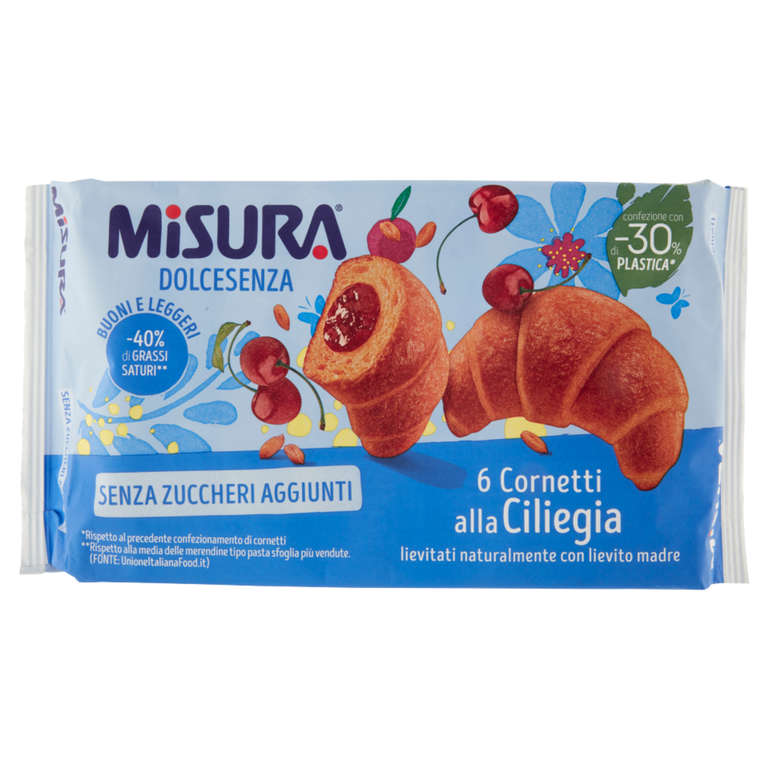 A Misura d'ambiente Tutela della natura, corretto utilizzo delle risorse, smaltimento sostenibile sono i principi che ci guidano per il benessere di oggi e soprattutto quello di domani. confezione con -30% di Plastica* Cosa Vuol Dire? L'incarto esterno di questo prodotto utilizza Carta certificata FSC per una gestione responsabile delle foreste e degli ecosistemi. Abbiamo così eliminato il 30% di plastica. *Rispetto al precedente confezionamento di cornetti Contribuisci anche tu alla cura dell'ambiente. Scopri di più su www.misura.it. Semplicemente Dolcesenza Una morbida pasta sfoglia lievitata naturalmente con lievito madre e gustosa farcitura alla ciliegia. Solo la dolcezza delle Materie Prime senza zuccheri aggiunti Nessun Segreto, il buono è tutto qui! Con lievito madre Senza grassi idrogenati Senza additivi conservanti e coloranti Fonte di fibre Con uova fresche italiane da galline allevate a terra Senza olio di palma Questo prodotto utilizza energia elettrica da fonti rinnovabili