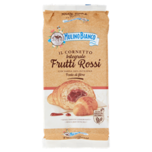 La Carta del Mulino Con farina da agricoltura sostenibile Ogni Cornetto di questa confezione è realizzato con grano tenero da agricoltura sostenibile, seguendo le 10 regole della Carta del Mulino, il disciplinare Mulino Bianco pensato per portare qualità nei prodotti, supportare il lavoro degli agricoltori e proteggere la biodiversità. L'intera filiera è certificata ISCC Plus. Scopri di più: mulinobianco.it/cdm Il buono che non vedi Tutte le nostre merende sono senza additivi conservanti e coloranti, senza grassi idrogenati e senza olio di palma. I Cornetti Integrali Frutti Rossi sono preparati solo con farina integrale di frumento, senza usare altri tipi di farine, per questo sono fonte di fibre. 38 Ore di lenta lievitazione - Con lievito madre Un impasto integrale, lievitato lentamente e lavorato in soffici strati di pasta sfoglia, incontra una golosa farcitura, preparata con ciliegie, fragole e lamponi e senza utilizzo di additivi conservanti: così nasce il Cornetto Integrale Frutti Rossi Mulino Bianco, naturalmente fonte di fibre.