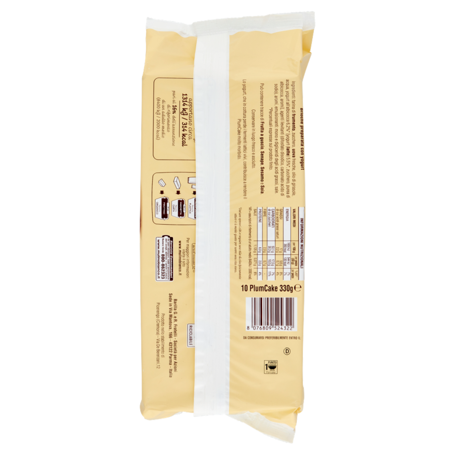 1 PlumCake Classico (33g) + 1 cappuccino (125ml) + 1 banana (150g) apportano circa 1314 kJ / 314 kcal pari al 16% dell'assunzione di riferimento di un adulto medio (8400 kJ / 2000 kcal) Lo yogurt, che in cottura perde i fermenti lattici vivi, contribuisce a rendere il PlumCake molto morbido. Variare spesso i cibi e seguire uno stile di vita fisicamente attivo è il modo giusto per avere una vita sana.