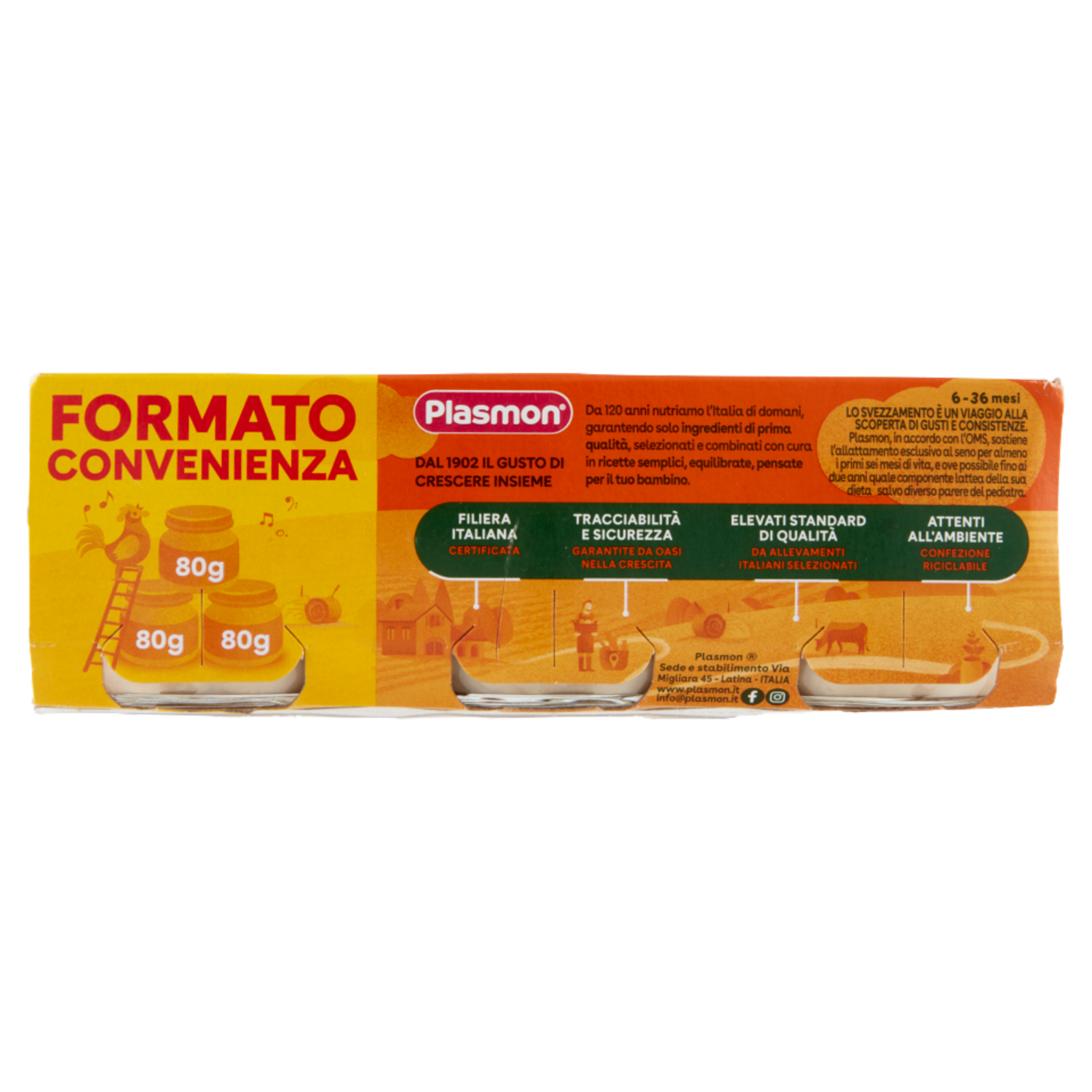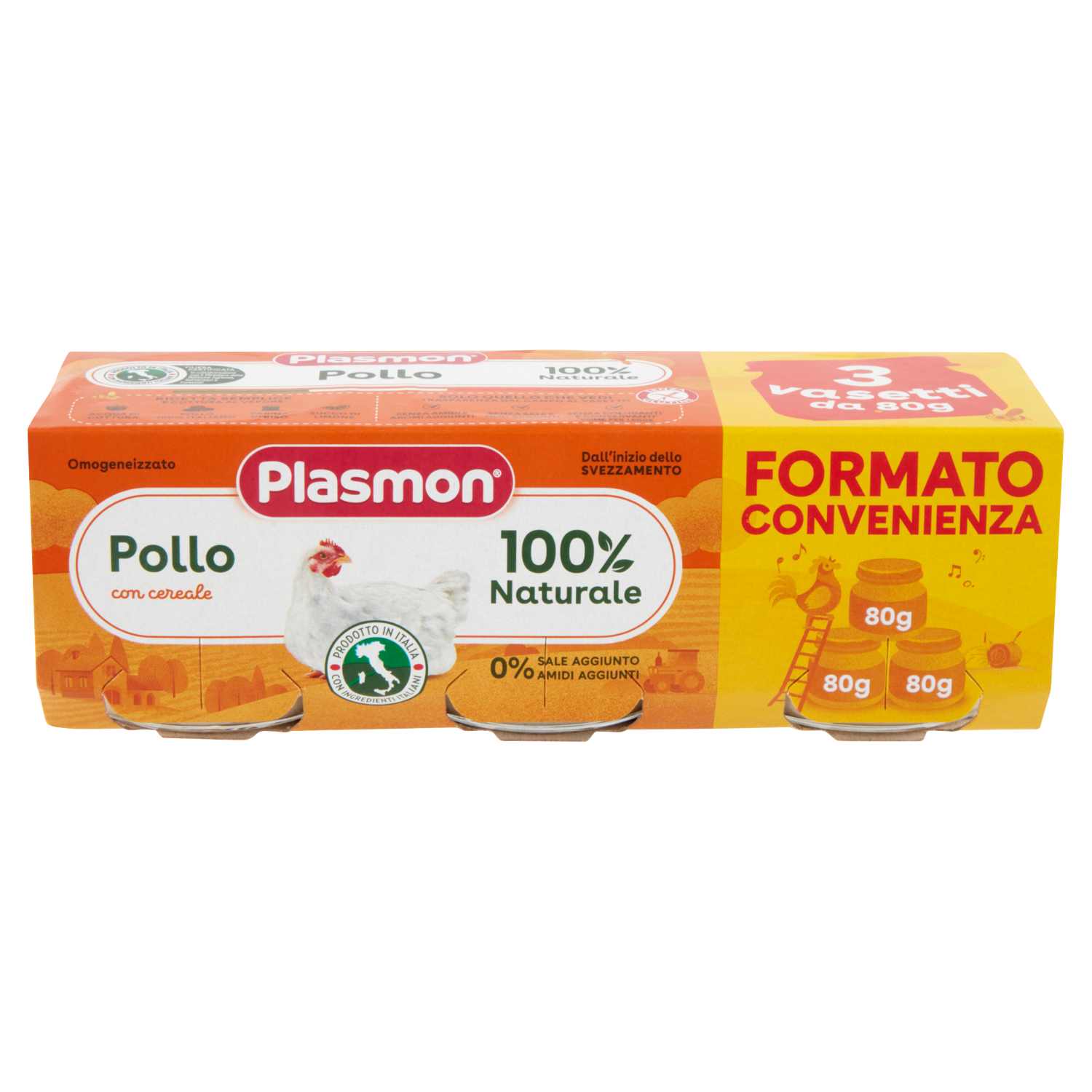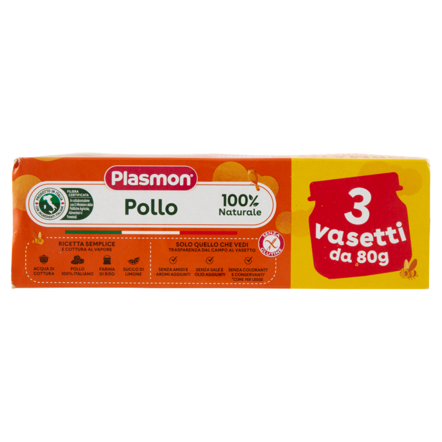 6 - 36 mesi Lo svezzamento è un viaggio alla scoperta di gusti e consistenze. Plasmon, in accordo con l'OMS, sostiene l'allattamento esclusivo al seno per almeno i primi sei mesi di vita, e ove possibile fino ai due anni quale componente lattea della sua dieta salvo diverso parere del pediatra. Filiera italiana certificata Tracciabilità e sicurezza garantite da Oasi nella crescita Elevati standard di qualità da allevamenti italiani selezionati Attenti all'ambiente confezione riciclabile Prodotto in Italia - Con ingredienti italiani Filiera certificata - In collaborazione con il Ministero delle Politiche Agricole, Alimentari e Forestali Ricetta semplice e cottura al vapore Acqua di cottura Pollo 100% Italiano Farina di riso Succo di limone Solo quello che vedi trasparenza dal campo al vasetto - Senza amidi e aromi aggiunti - Senza sale e olio aggiunti - Senza coloranti* e conservanti* *Come per legge Senza glutine