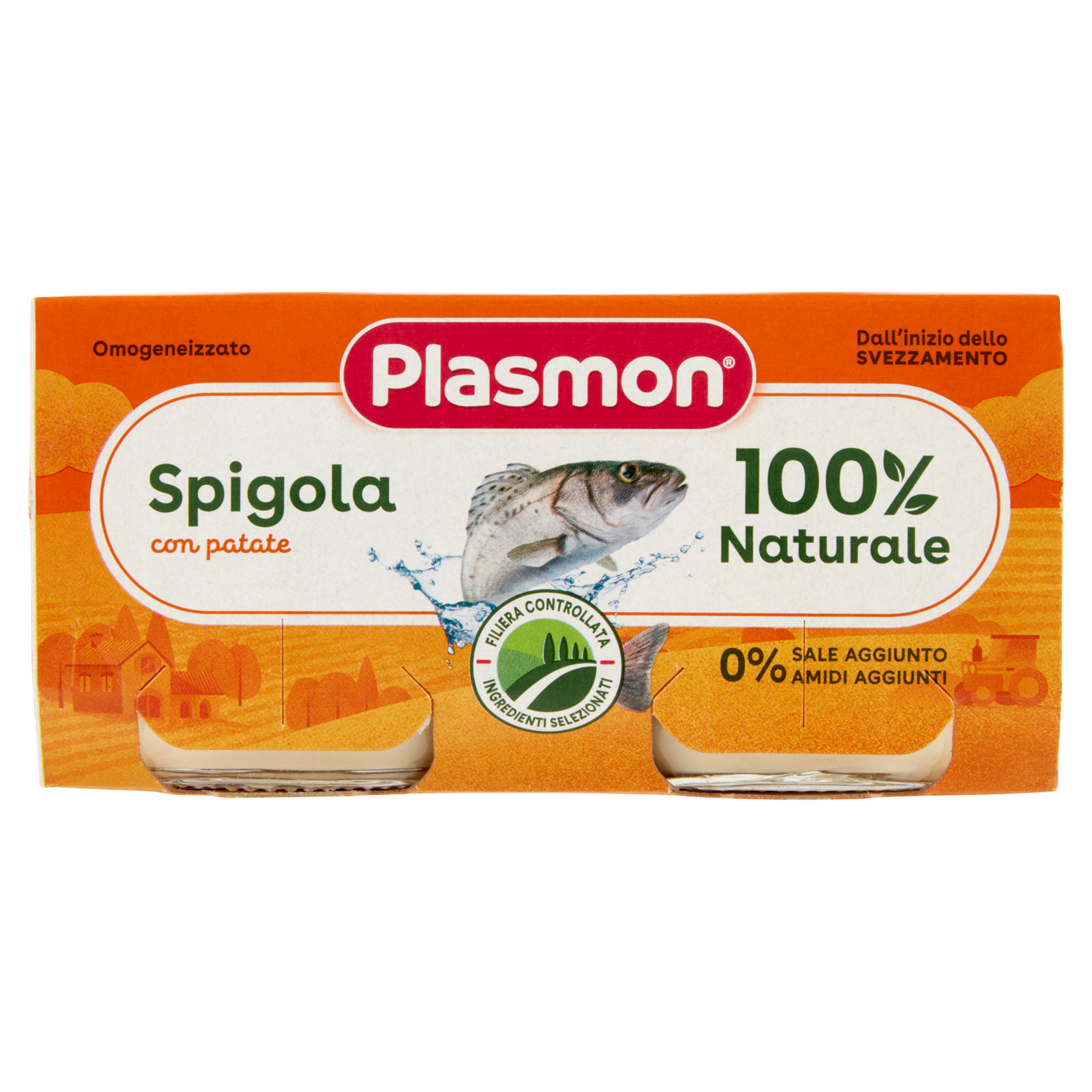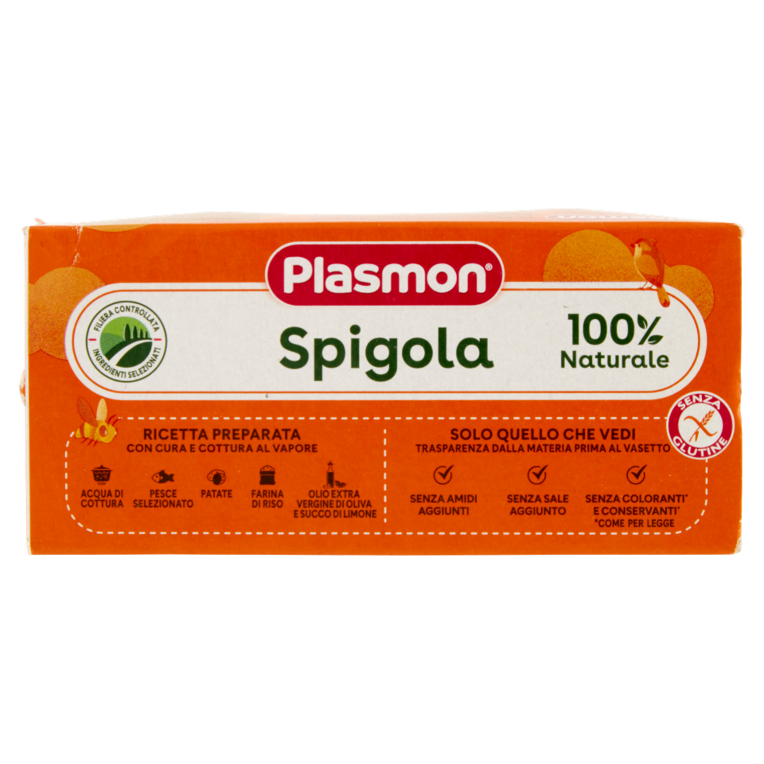6 - 36 mesi Lo svezzamento è un viaggio alla scoperta di gusti e consistenze. Plasmon, in accordo con l'OMS, sostiene l'allattamento esclusivo al seno per almeno i primi sei mesi di vita, e ove possibile fino ai due anni quale componente lattea della sua dieta salvo diverso parere del pediatra. Filiera tracciata e controllata Tracciabilità e sicurezza garantite da Oasi nella crescita Elevati standard di qualità materia prima selezionata Attenti all'ambiente confezione riciclabile Filiera controllata - Ingredienti selezionati Ricetta preparata con cura e cottura al vapore Acqua di cottura Pesce selezionato Patate Farina di riso Olio extra vergine di oliva e succo di limone Solo quello che vedi trasparenza dalla materia prima al vasetto - Senza amidi aggiunti - Senza sale aggiunto - Senza coloranti* e conservanti* *Come per legge Senza glutine