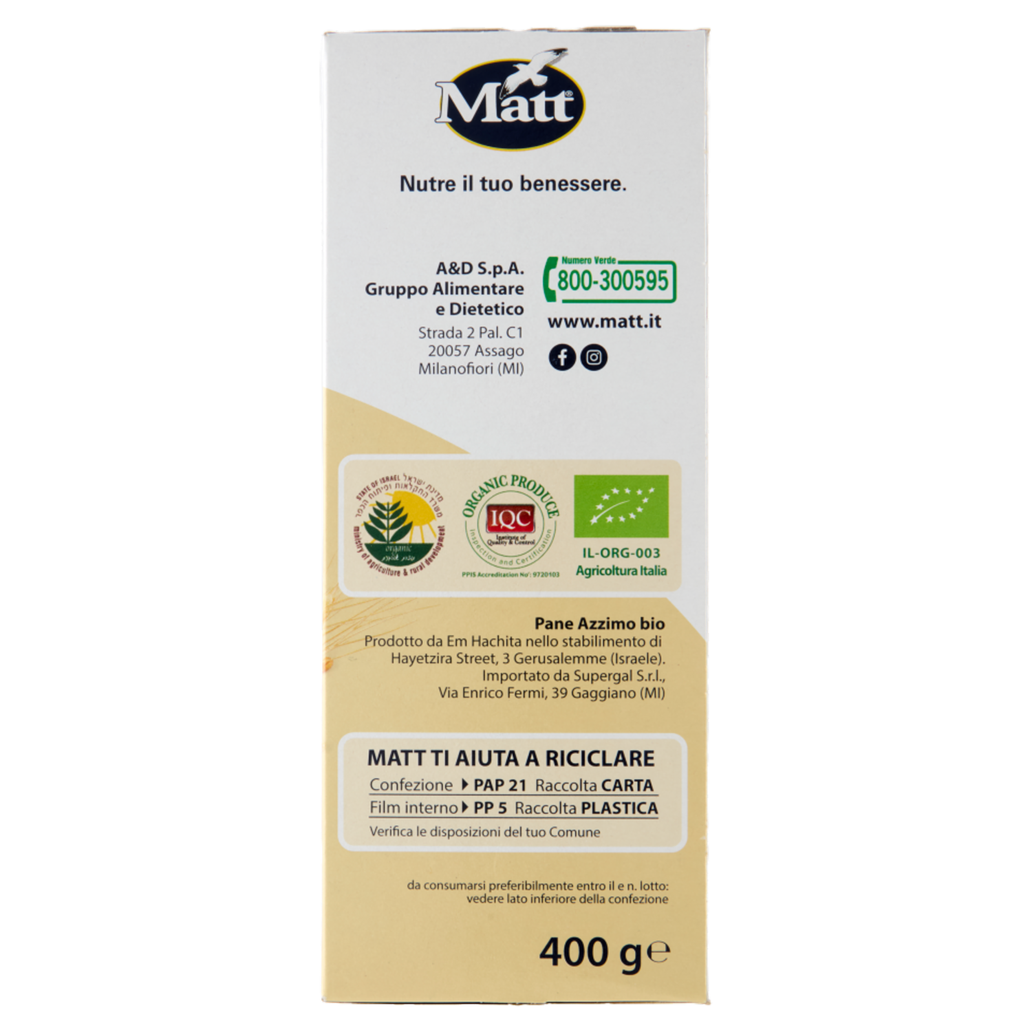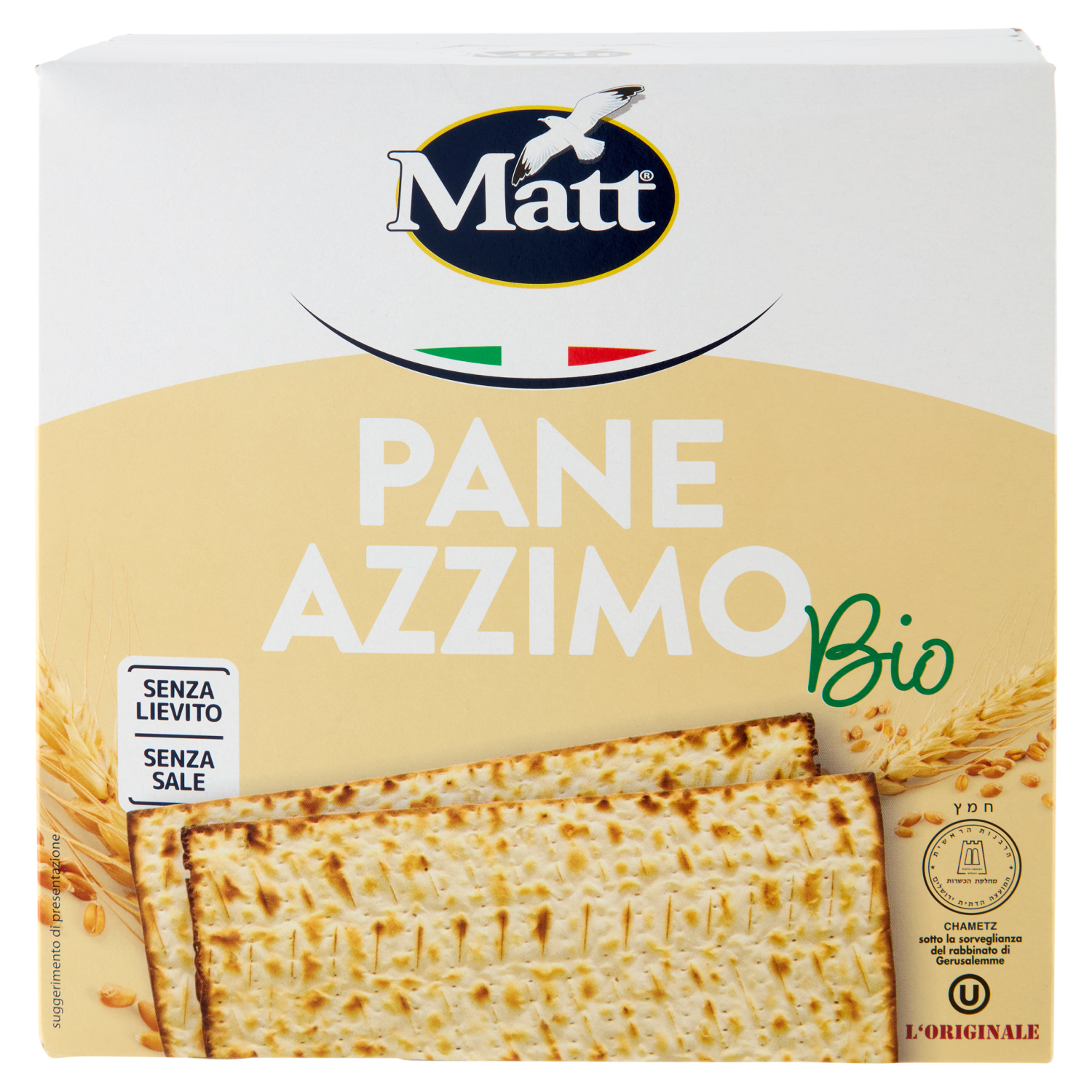 Pane Azzimo bio è una valida alternativa al pane, prodotto secondo l'originale e rigorosa tradizione religiosa ebraica. Senza lievito, senza sale, senza zuccheri aggiunti e a basso contenuto di grassi, può essere un valido aiuto per chi vuole alimentarsi in modo sano e mantenersi in forma. L'assenza di lievito e agenti lievitanti, lo rendono un'ottima scelta per chi presenta un'intolleranza a questo ingrediente, sia naturale che chimico. L'assenza di sale, inoltre, è utile per chi vuole tenere sotto controllo l'apporto di questo elemento. Le fette all'interno sono protette da una confezione salvafreschezza, per garantire tutta la fragranza del prodotto. L'originale ricetta ebraica del pane azzimo prevede che l'impasto del pane sia solo farina e acqua, senza l'impiego di altri ingredienti. Ciò che caratterizza il pane azzimo prodotto in Israele da qualsiasi altro pane azzimo prodotto altrove è il tipo di lavorazione degli ingredienti, che rende il prodotto unico nel suo genere per la sua fragranza, la sua consistenza croccante e il suo gusto pieno e unico. Solo questo tipo di lavorazione assicura l'originalità del pane azzimo. ... non solo bio - prodotto Vegetale - a basso contenuto di Grassi - senza Zuccheri aggiunti° - senza Lievito - senza Sale ° Contiene naturalmente zuccheri Adatto anche all'alimentazione vegana