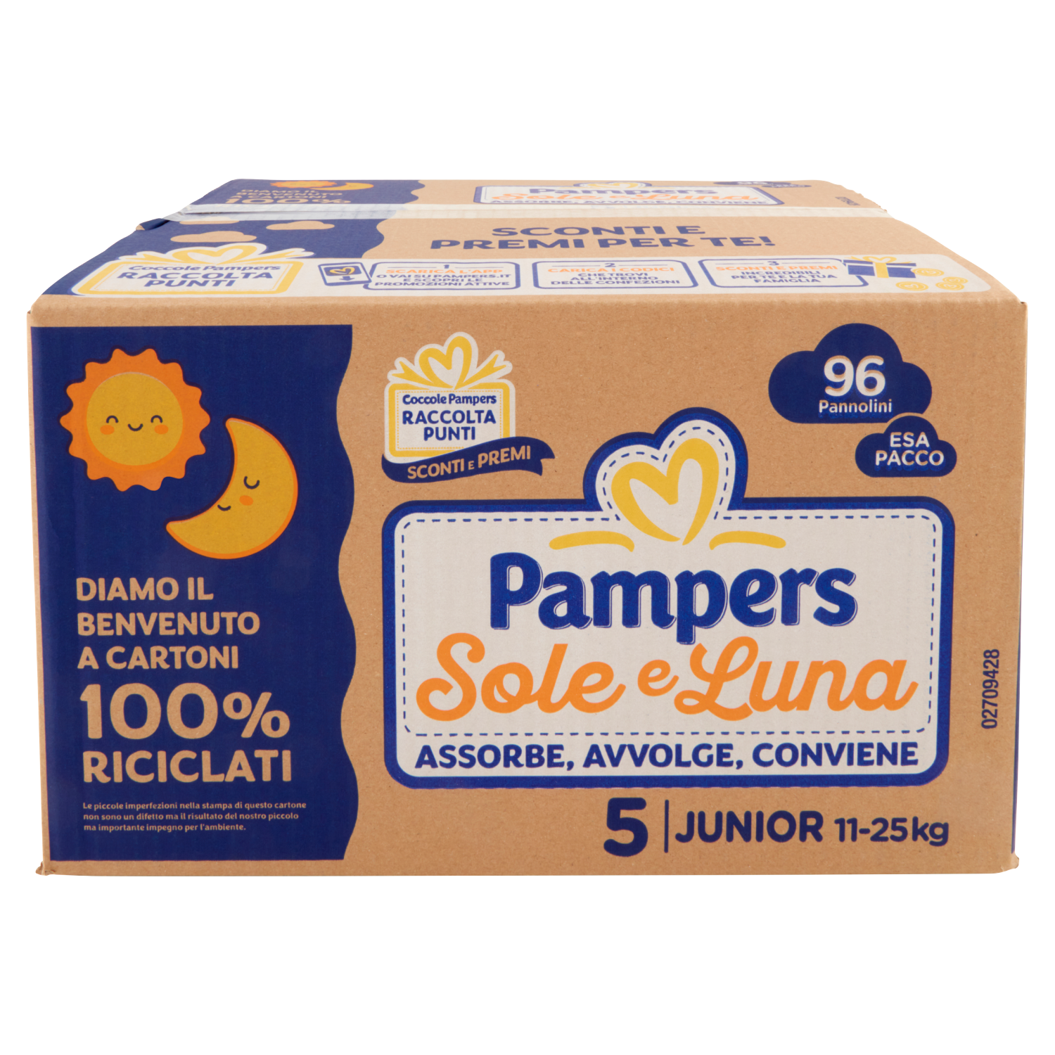 Mamma, scopri il Nuovo Pampers Sole e Luna. È Più Assorbente perchè da oggi ancora più ricco di microgranuli assorbi-pipì, per aiutarti a evitare le f uoriuscite e per proteggere la pelle del tuo bambino. Così puoi dargli l'as ciutto e la protezione di cui ha bisogno, ad un prezzo super conveniente. Orecchiette elastiche Delicata essenza camomilla Lozione con aloe