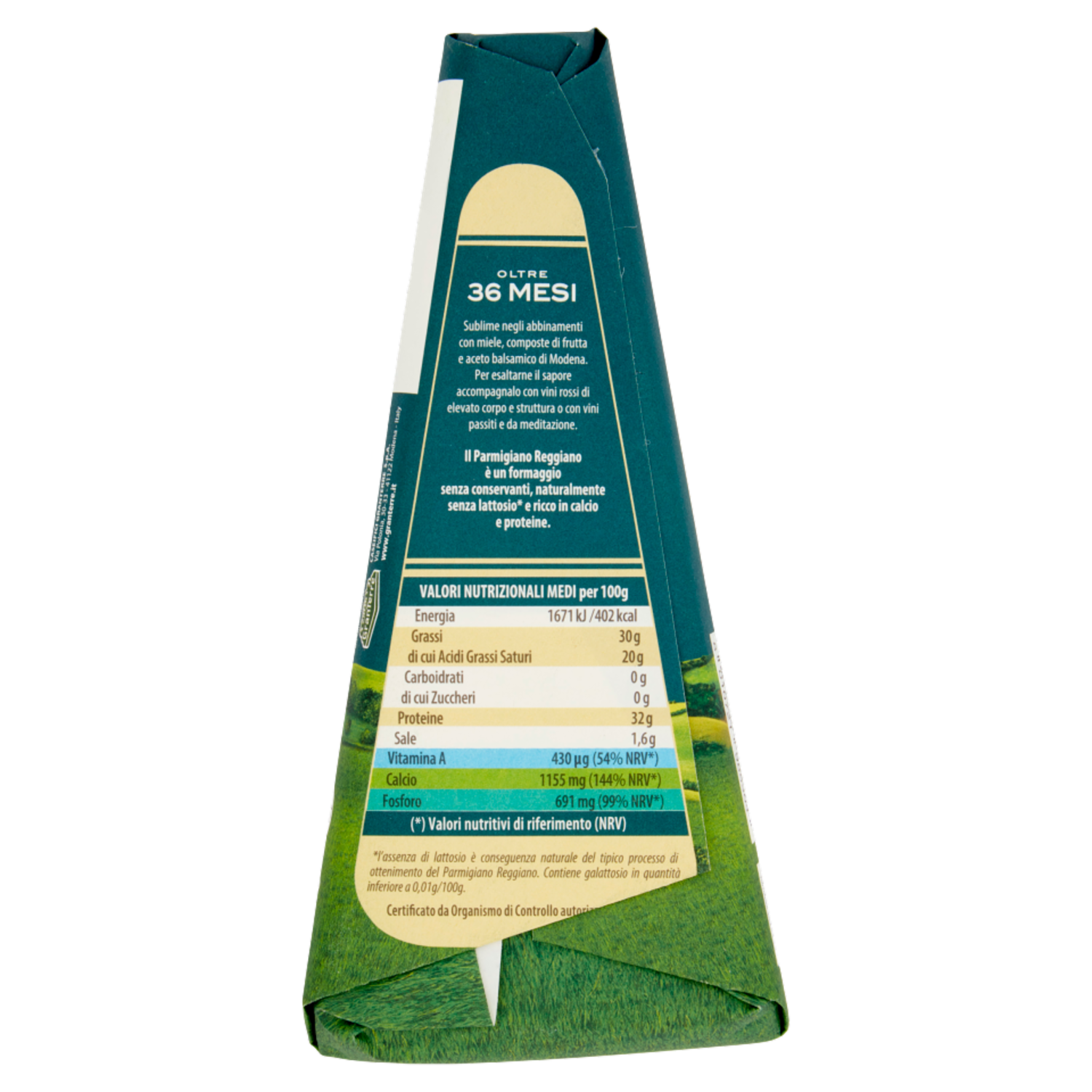 La stagionatura di oltre 36 mesi lo rende un formaggio friabile e granuloso, con un gusto deciso nel quale predominano note di spezie e di frutta secca. Oltre 36 mesi Sublime negli abbinamenti con miele, composte di frutta e aceto balsamico di Modena. Per esaltarne il sapore accompagnalo con vini rossi di elevato corpo e struttura o con vini passiti e da meditazione. Il Parmigiano Reggiano è un formaggio senza conservanti, naturalmente senza lattosio* e ricco in calcio e proteine. *l'assenza di lattosio è conseguenza naturale del tipico processo di ottenimento del Parmigiano Reggiano. Contiene galattosio in quantità inferiore a 0,01g/100g.