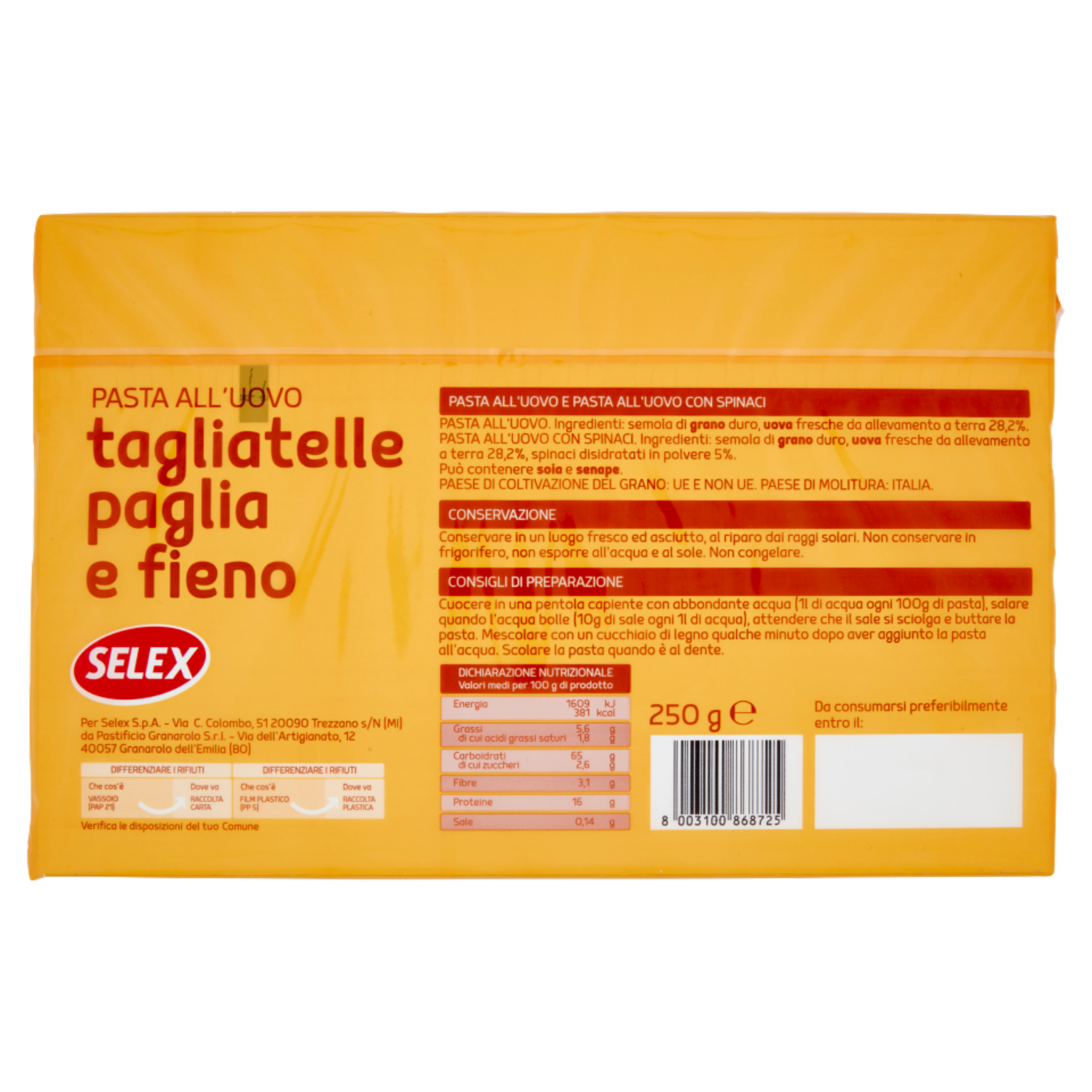 Pasta all'uovo. Ingredienti: semola di grano duro, uova fresche da allevamento a terra 28,2%