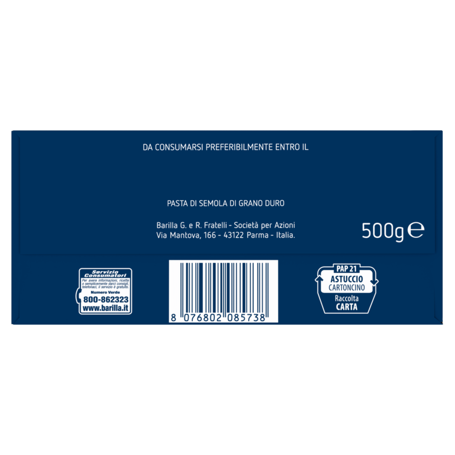 Barilla G. e R. Fratelli - Società per Azioni Via Mantova, 166 43122 Parma Italia Prodotto nello stabilimento indicato con la lettera fra parentesi vicino alla data: (A) Parma - Via Mantova, 166 (F) Foggia - S.S. 16 km 684+300 (E) Marcianise (Caserta) - S.S. 87 km 20+500 (MU) Muggia (Trieste) - Strada delle Saline, 29