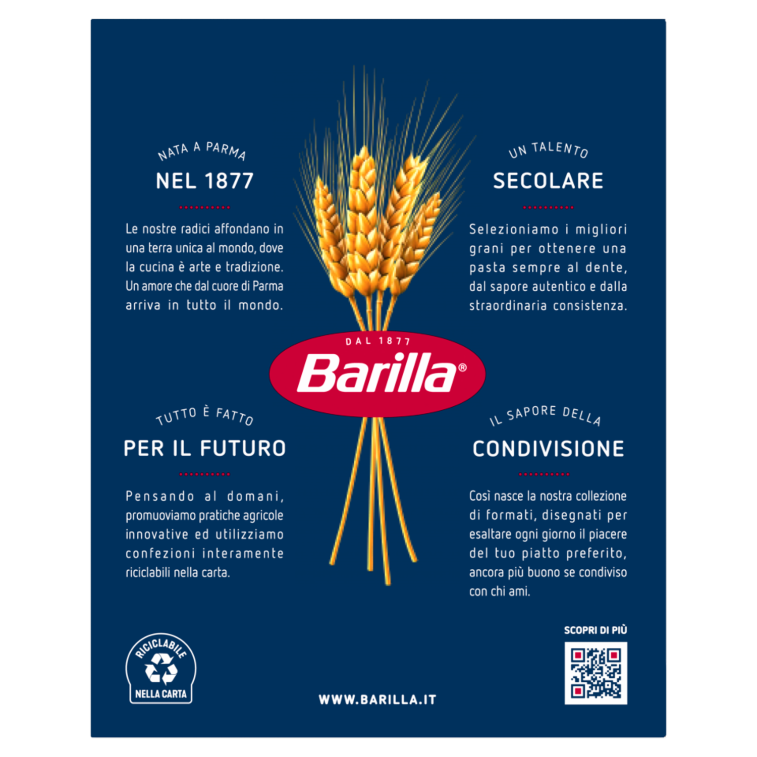 Barilla Dal 1877 Grani selezionati 100% italiani Siamo fieri di essere al fianco delle organizzazioni di 8.000 agricoltori d'Italia che coltivano grano duro di qualità per la nostra pasta. A Parma dal 1877 A Parma il buon cibo è tradizione ed eccellenza gastronomica, gioia di vivere e cultura: qui è dove siamo nati. Il domani è oggi La pasta Barilla la conosci da sempre: perciò abbiamo tolto la finestra trasparente, risparmiando 126.000 kg di plastica all'anno.* Un gesto d'amore Ogni giorno ci impegniamo a darti la nostra pasta migliore, sempre al dente, per far felice chi ami. *rimozione finestra dai Classici Barilla; valore calcolato sulle confezioni in cartoncino vendute nel 2020. Scopri di più su barilla.com/box. Per noi la qualità è una tradizione di famiglia dal 1877. www.barilla.it