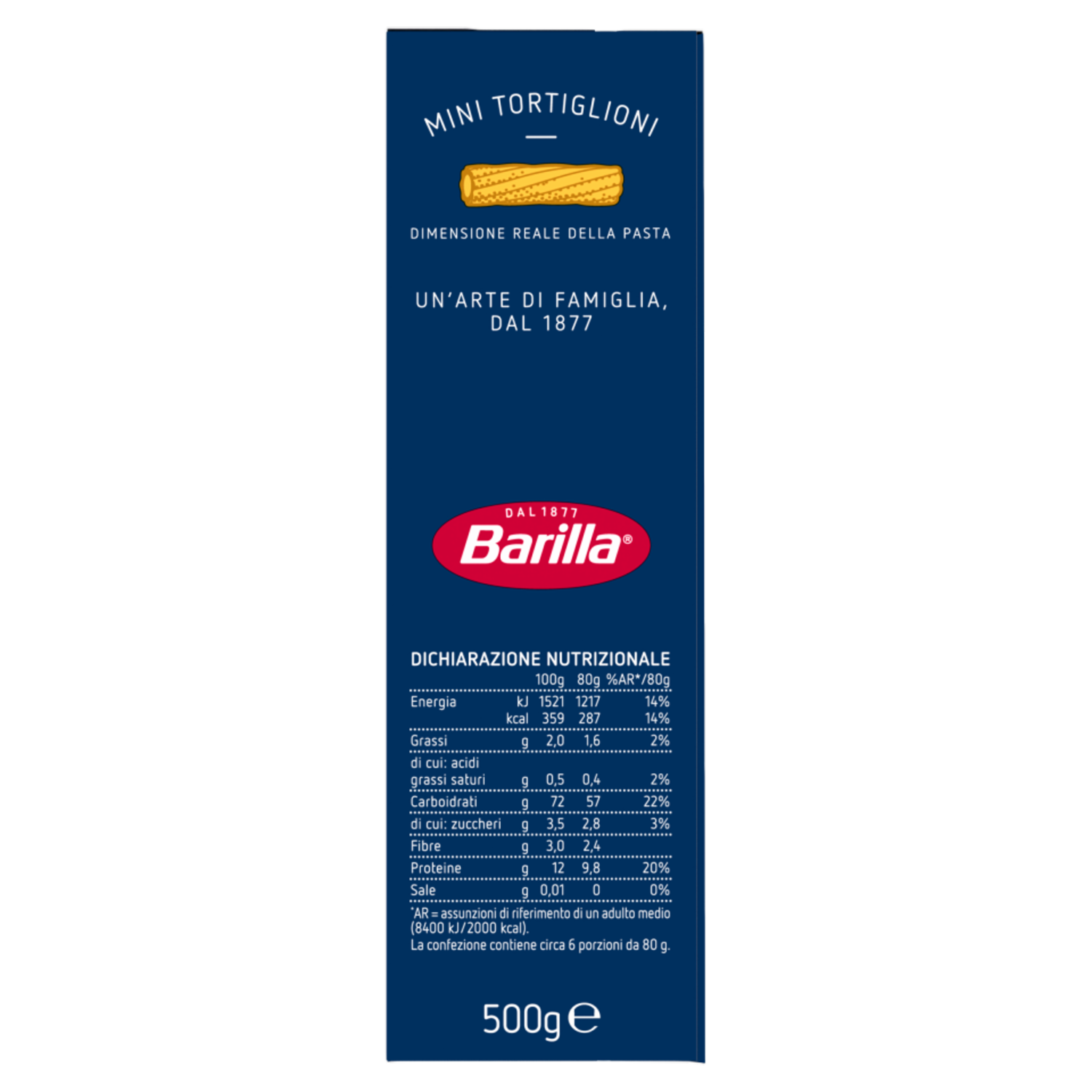 Barilla Dal 1877 Bontà dal cuore italiano Così come ti prendi cura della tua famiglia, noi ci prendiamo cura della nostra pasta: per questo prodotto selezioniamo solo grano duro 100% italiano. La magia negli occhi dei bambini Sorprendi i tuoi bambini aggiungendo alle tue ricette un tocco di creatività con i mini formati di piccolini. Per il loro domani Abbiamo tolto la finestra da questa confezione, un piccolo contributo per lasciare al nostri bambini un pianeta con meno plastica*. Un gesto d'amore Ogni giorno ci impegniamo a darti la nostra pasta migliore per far felici grani e piccini. *scopri di più su barila.com/box Piccolini si nasce, grandi si diventa Per grandi e bambini sopra i 3 anni www.barilla.it