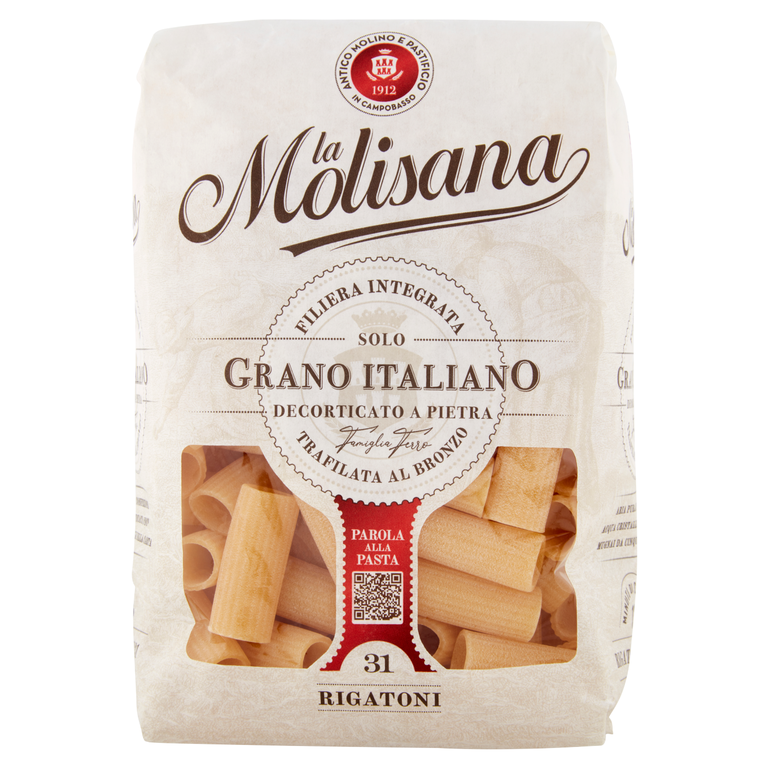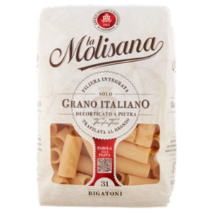 La Molisana Antico Molino e Pastificio in Campobasso 1912 Famiglia Ferro Azienda 100% italiana da filiera integrata Fondata nel 1912 da una famiglia di imprenditori italiani, interamente di proprietà italiana. Il grano Utilizziamo solo grano coltivato in Molise, Abruzzo, Puglia, Lazio e Marche, regioni da sempre vocate alla produzione di grano duro di alta qualità. Il molino Maciniamo da cinque generazioni il miglior grano, lo decortichiamo a pietra per produrre semole più sicure dal punto di vista igienico-sanitario. Il pastificio Trafiliamo al bronzo per ottenere una pasta ruvida e tenace con un'eccellente tenuta in cottura. L'acqua Impastiamo le nostre semole con acqua pura, iposodica con caratteristiche oligominerali delle sorgenti del Matese. LifeGate impatto zero CO₂ La Molisana partecipa al progetto Impatto Zero di LifeGate grazie al quale sono state calcolate, ridotte e compensate le emissioni di CO2 derivanti dalla produzione di questa confezione, tramite l'acquisto di crediti di carbonio generati dalla creazione e tutela di foreste nel mondo. Aria pura di montagna Acqua cristallina di sorgente Mugnai da cinque generazioni