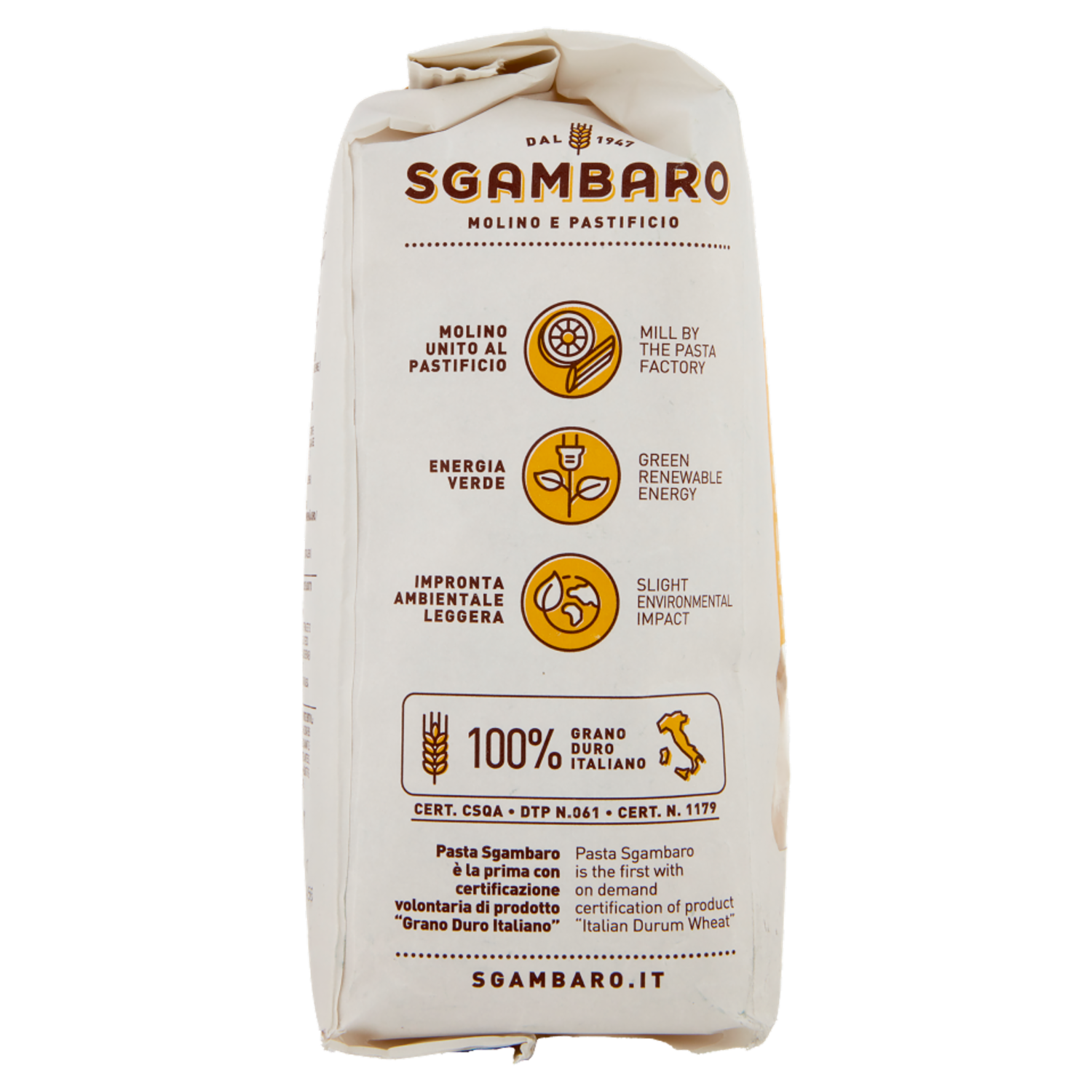 100% Grano duro italiano - Cert. CSQA - DTP n.061 - Cert. n. 1179 - Pasta Sgambaro è la prima con certificazione volontaria di prodotto "Grano Duro Italiano"