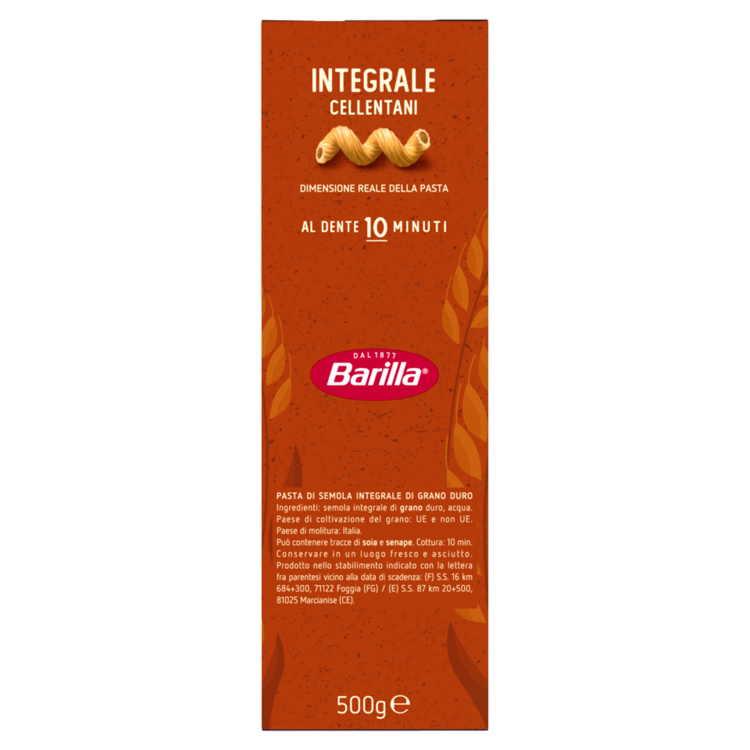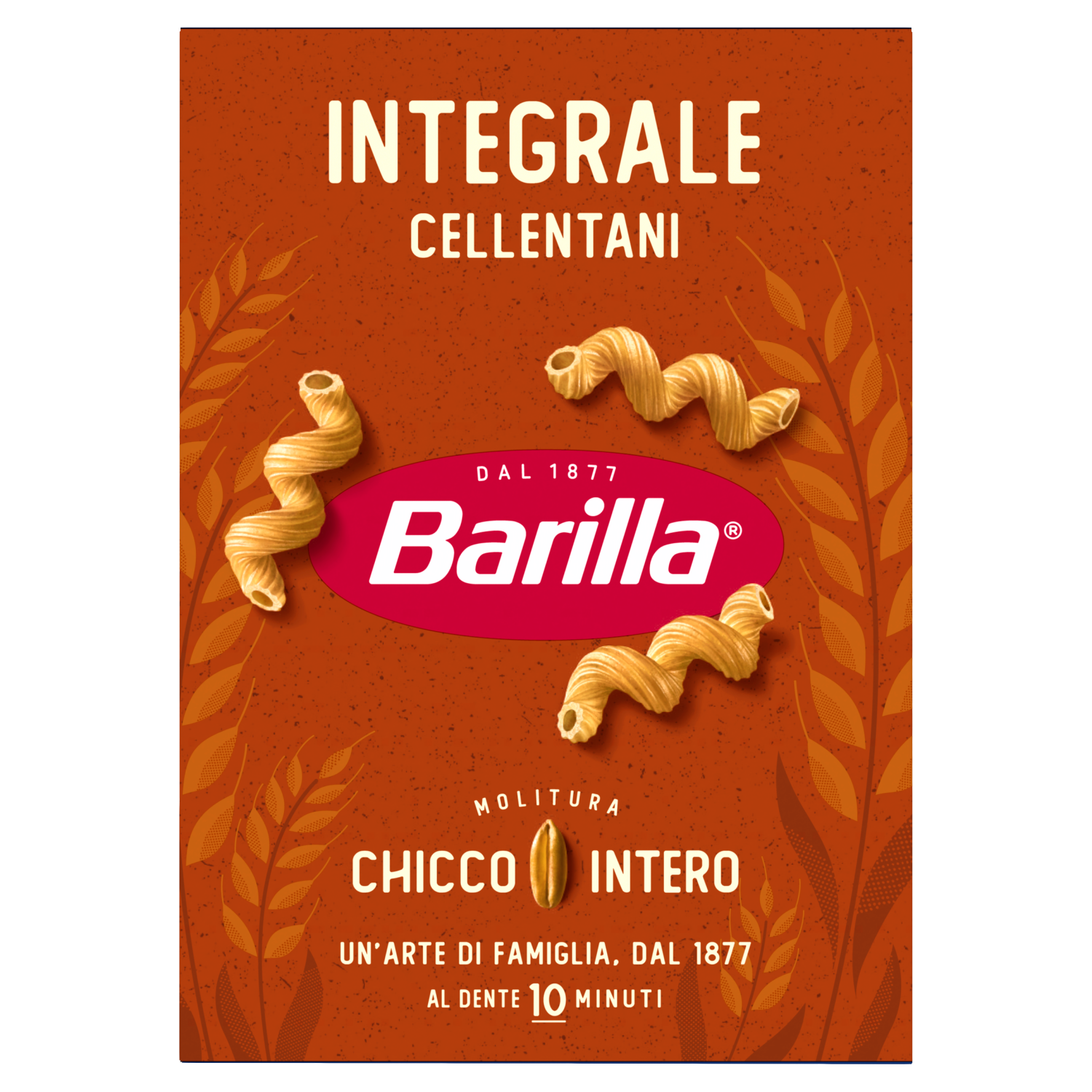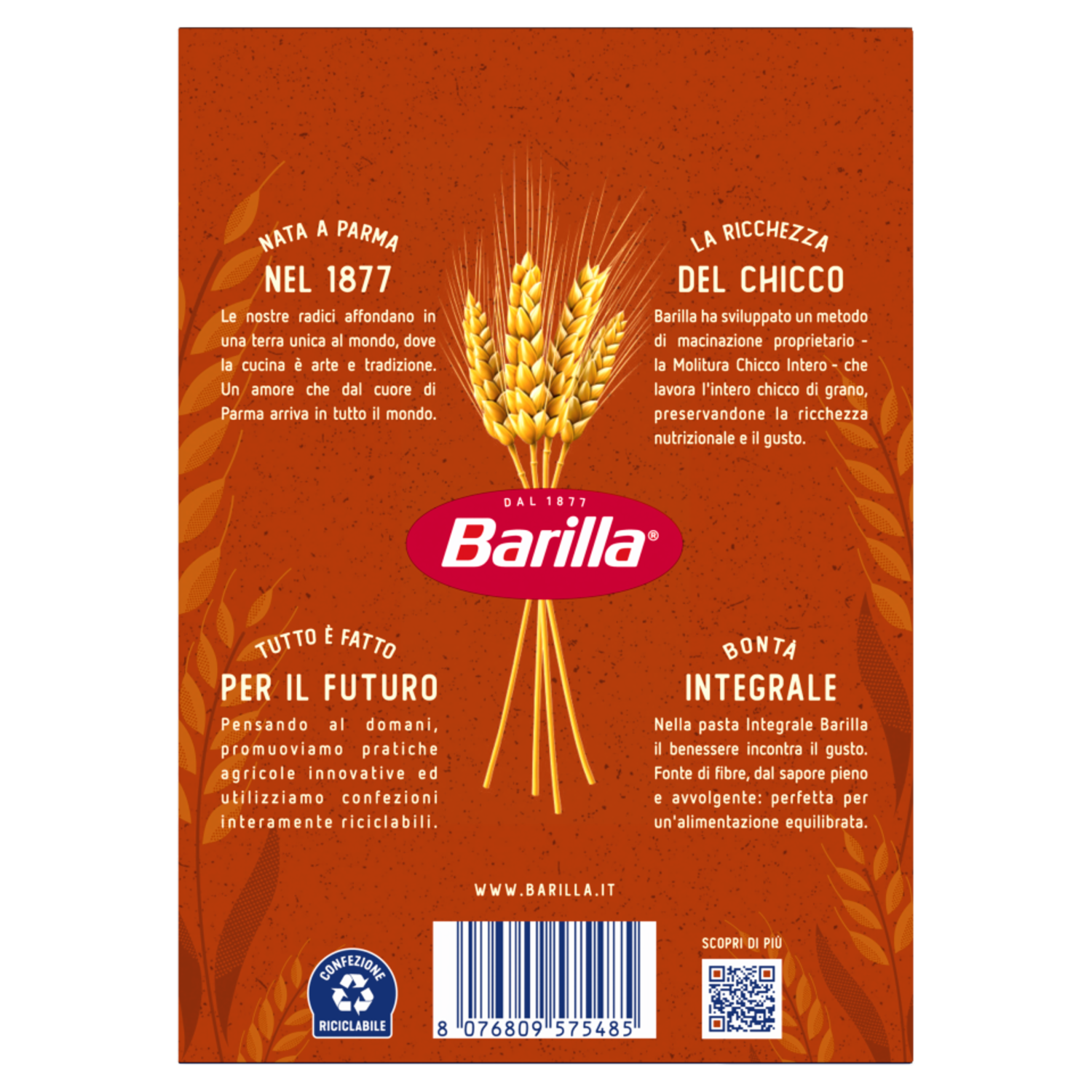 Barilla Dal 1877 Gusto per la vita Bontà e benessere si incontrano nella pasta Integrale Barilla: fonte di fibre, sempre al dente, dal gusto ricco, un'autentica gioia per il palato. Ideale per chi cerca vitalità insieme al piacere del buon cibo. Tutta la ricchezza del chicco Nuova molitura Barilla - Chicco intero La Molitura Chicco Intero è il nuovo processo di macinazione Barilla che permette di conservare la ricchezza nutrizionale e il sapore pieno dei grani selezionati 100% italiani. Un gesto d'amore Grazie alla Molitura Chicco Intero riduciamo il consumo di acqua e le emissioni di anidride carbonica del nostro processo di macinazione. Rinunciando alla finestra nella confezione diamo il nostro contributo per un futuro con meno plastica. Scopri di più su barilla.com/box Per noi la qualità è una tradizione di famiglia dal 1877. www.barilla.it