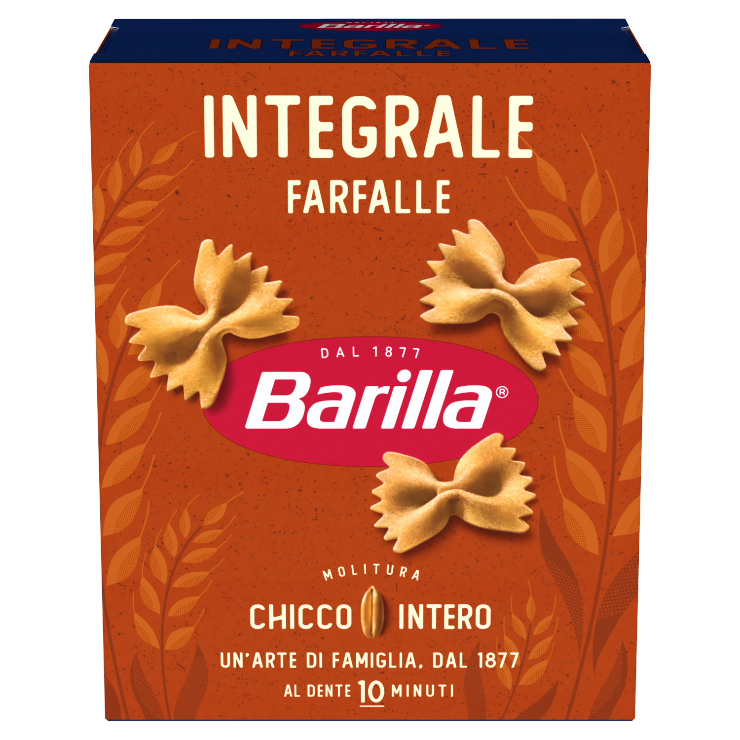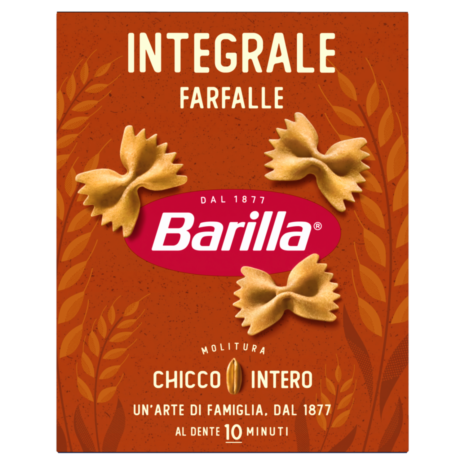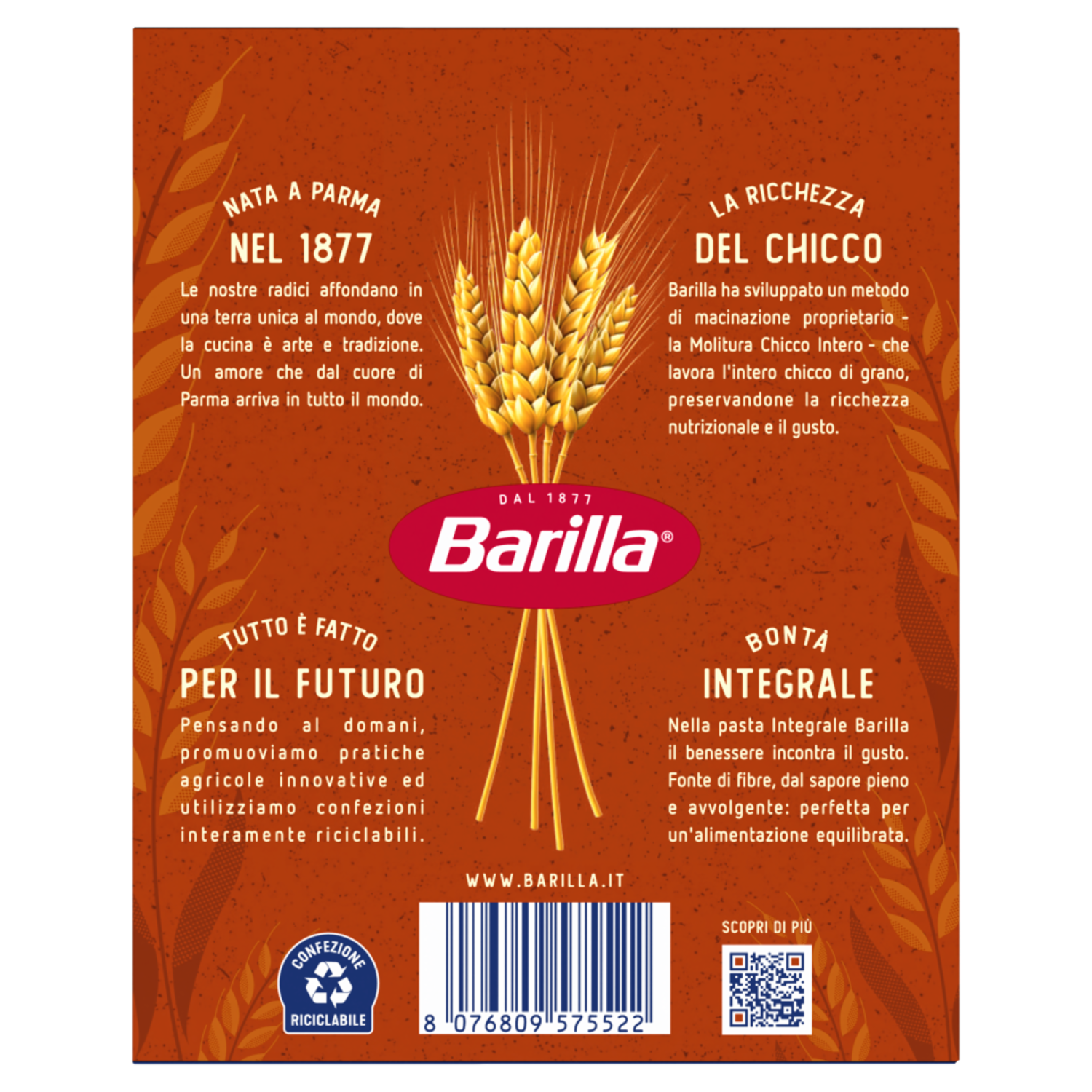 Barilla Dal 1877 Gusto per la vita Bontà e benessere si incontrano nella pasta Integrale Barilla: fonte di fibre, sempre al dente, dal gusto ricco, un'autentica gioia per il palato. Ideale per chi cerca vitalità insieme al piacere del buon cibo. Tutta la ricchezza del chicco Nuova molitura Barilla - Chicco intero La Molitura Chicco Intero è il nuovo processo di macinazione Barilla che permette di conservare la ricchezza nutrizionale e il sapore pieno dei grani selezionati 100% italiani. Un gesto d'amore Grazie alla Molitura Chicco Intero riduciamo il consumo di acqua e le emissioni di anidride carbonica del nostro processo di macinazione. Rinunciando alla finestra nella confezione diamo il nostro contributo per un futuro con meno plastica. Scopri di più su barilla.com/box Per noi la qualità è una tradizione di famiglia dal 1877. www.barilla.it