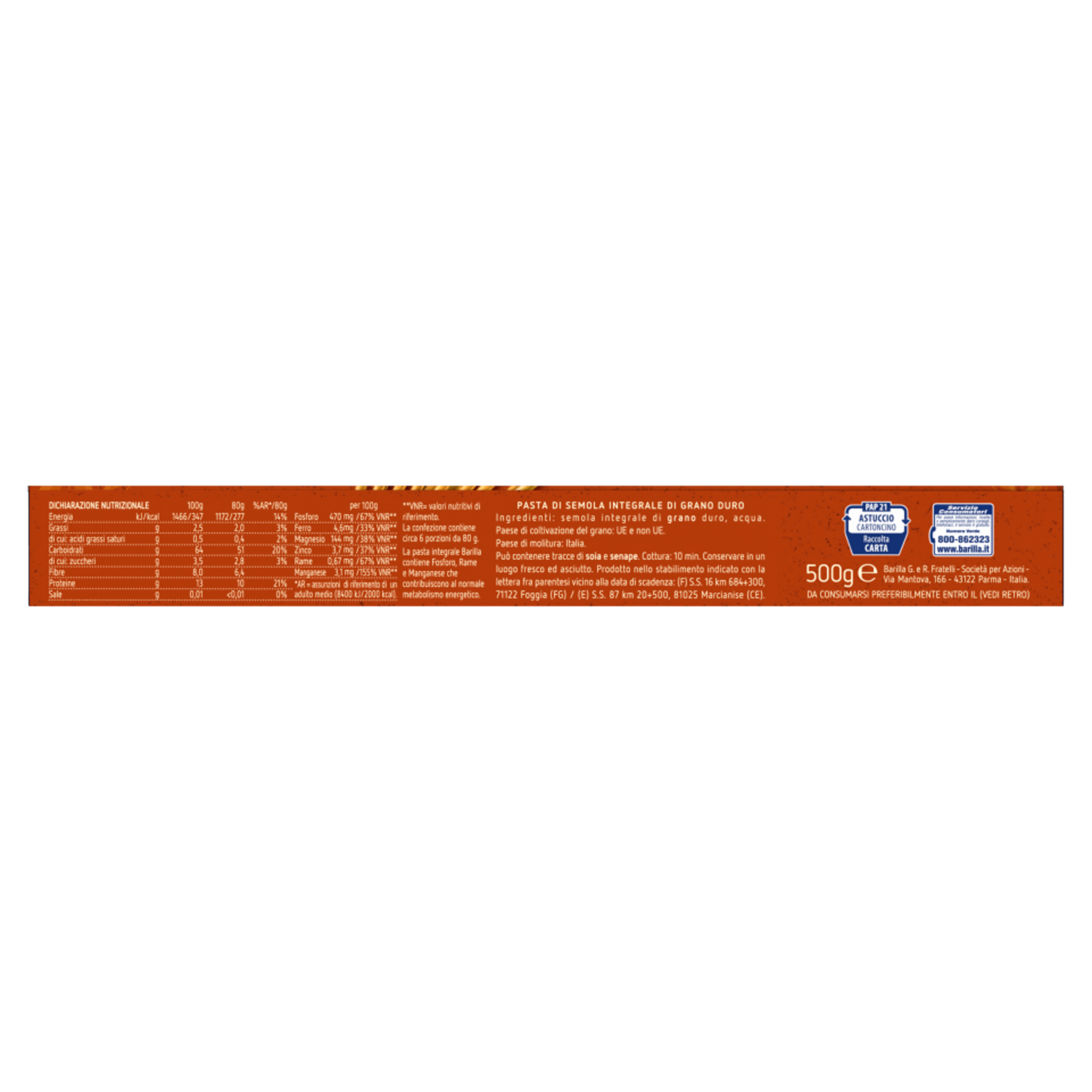 La pasta integrale Barilla contiene Fosforo, Rame e Manganese che contribuiscono al normale metabolismo energetico.