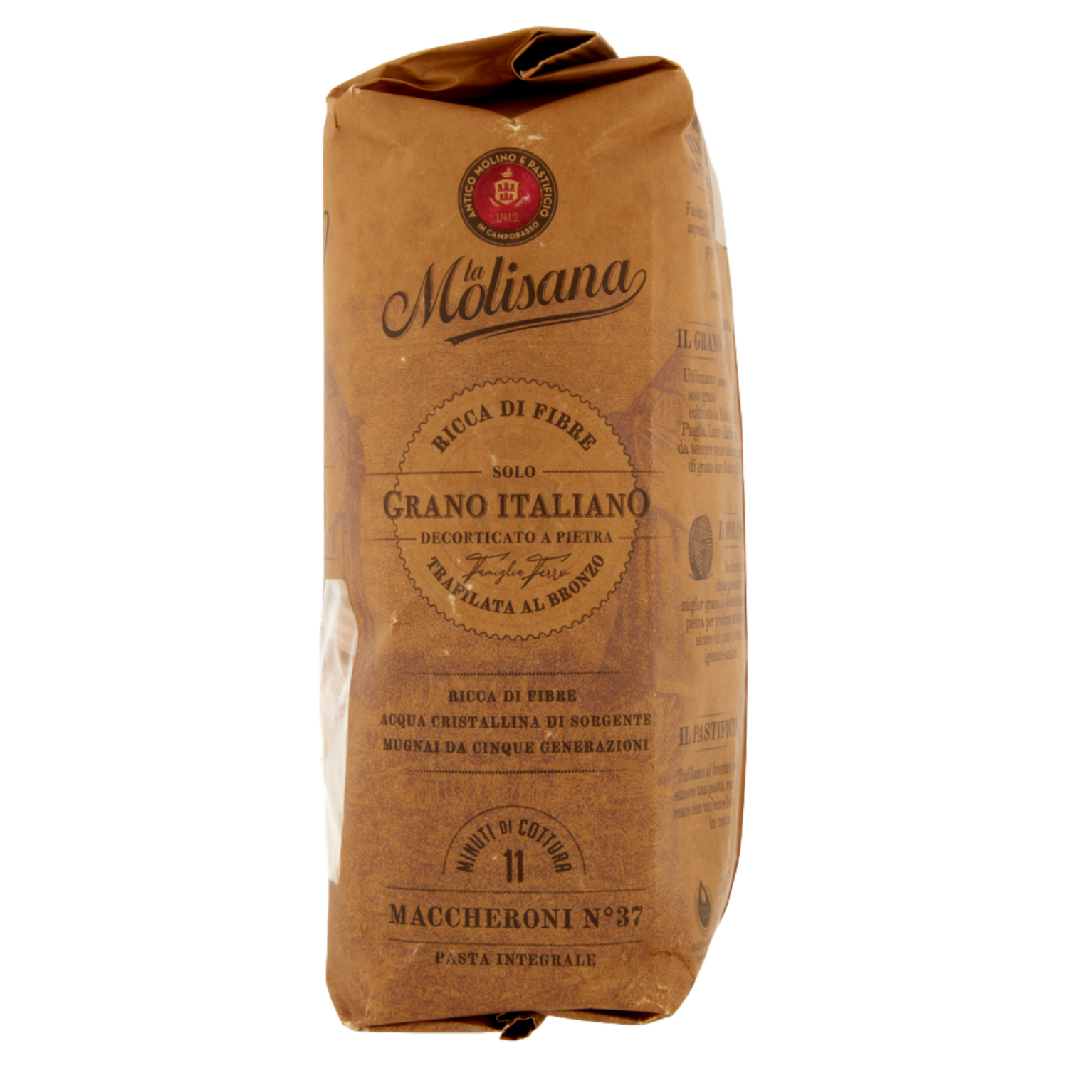 La Molisana Antico Molino e Pastificio in Campobasso 1912 Famiglia Ferro Azienda 100% italiana da filiera integrata Fondata nel 1912 da una famiglia di imprenditori italiani, interamente di proprietà italiana. Il grano Utilizziamo solo grano coltivato in Molise, Abruzzo, Puglia, Lazio e Marche, regioni da sempre vocate alla produzione di grano duro di alta qualità. Il molino Maciniamo da cinque generazioni il miglior grano, lo decortichiamo a pietra per produrre semole più sicure dal punto di vista igienico-sanitario. Il pastificio Trafiliamo al bronzo per ottenere una pasta ruvida e tenace con un'eccellente tenuta in cottura. L'acqua Impastiamo le nostre semole con acqua pura, iposodica con caratteristiche oligominerali delle sorgenti del Matese. Lifegate impatto zero CO₂ La Molisana partecipa al progetto Impatto Zero di LifeGate grazie al quale sono state calcolate, ridotte e compensate le emissioni di CO2 prodotte da questa confezione tramite l'acquisto di crediti di carbonio generati dalla creazione e tutela di foreste in crescita in Madagascar, Brasile e Italia. Ricca di fibre Acqua cristallina di sorgente Mugnai da cinque generazioni