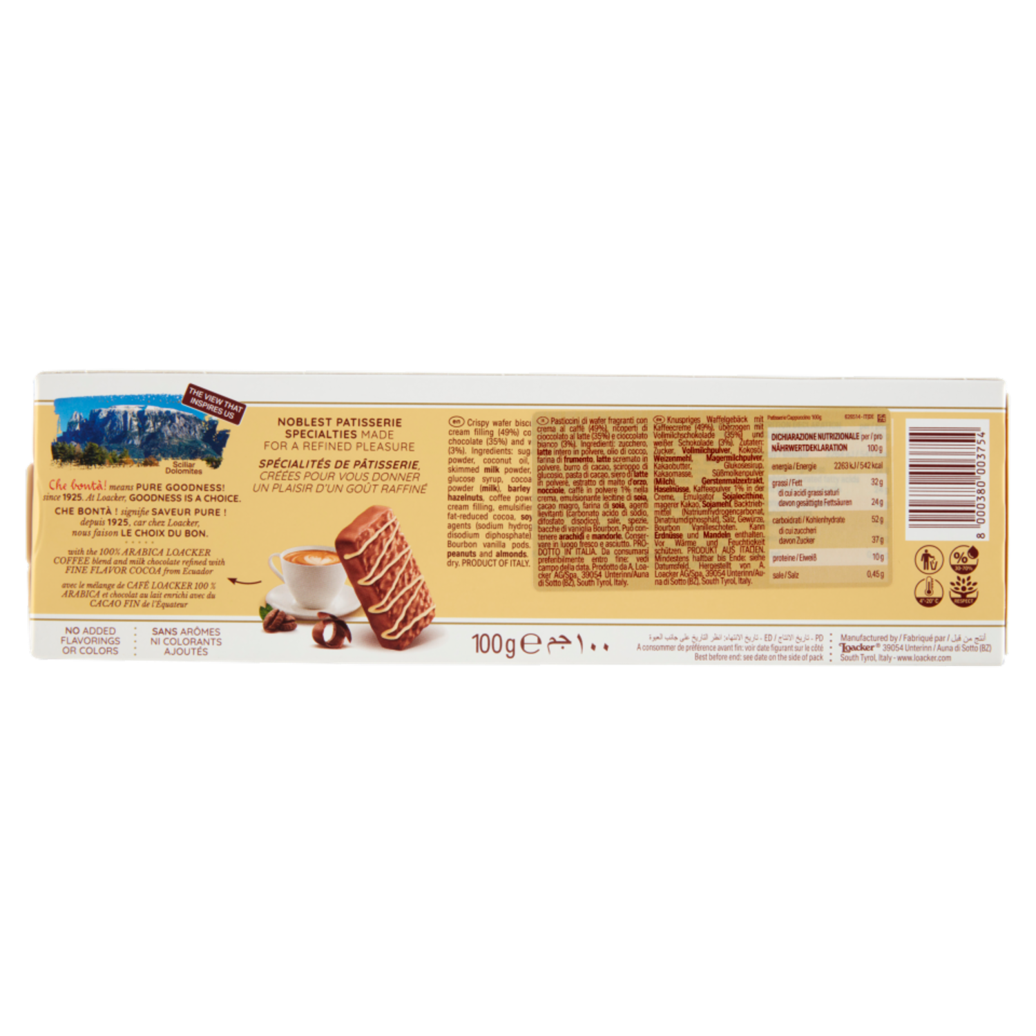 Pasticcini di wafer fragranti con crema al caffè (49%), ricoperti di cioccolato al latte (35%) e cioccolato bianco (3%)
