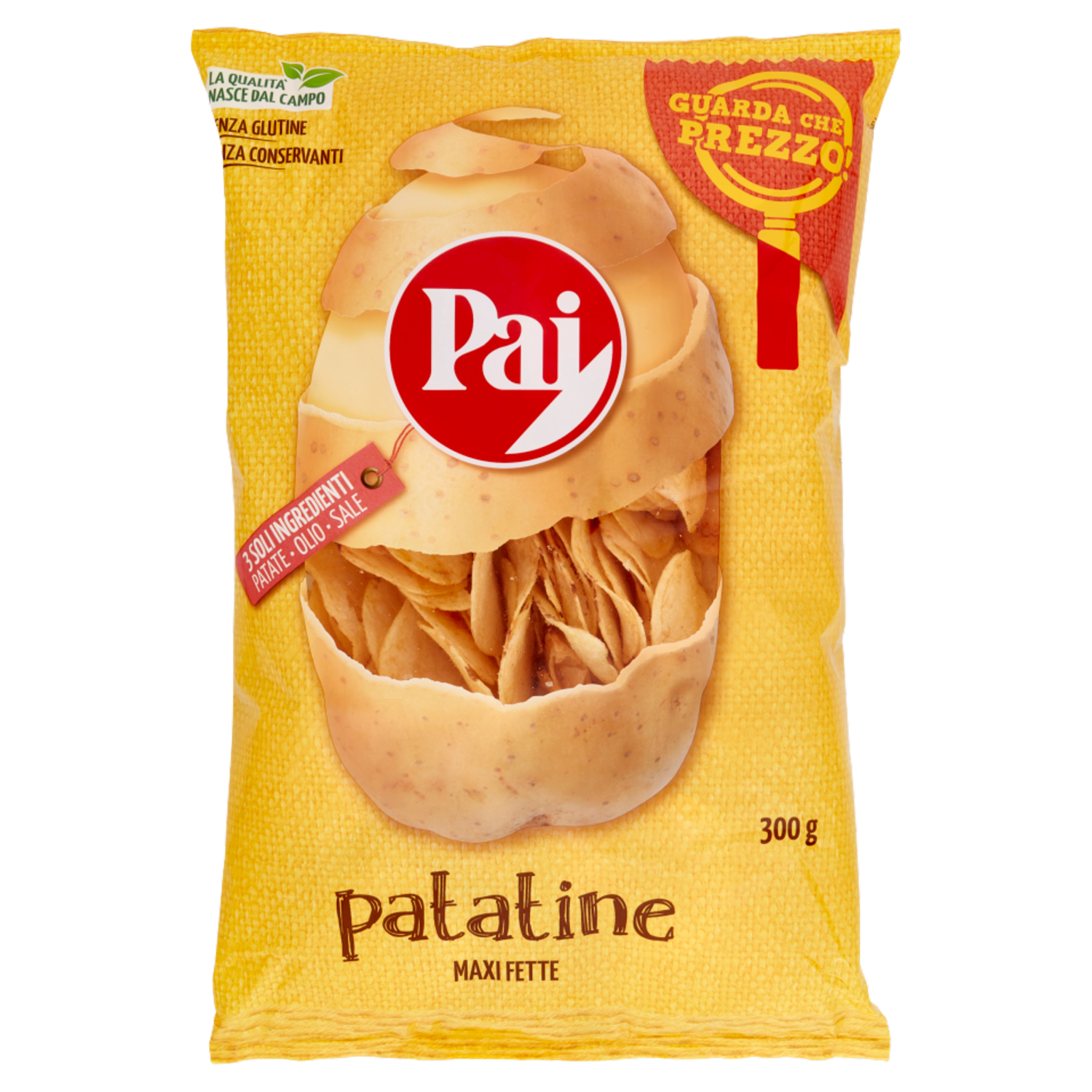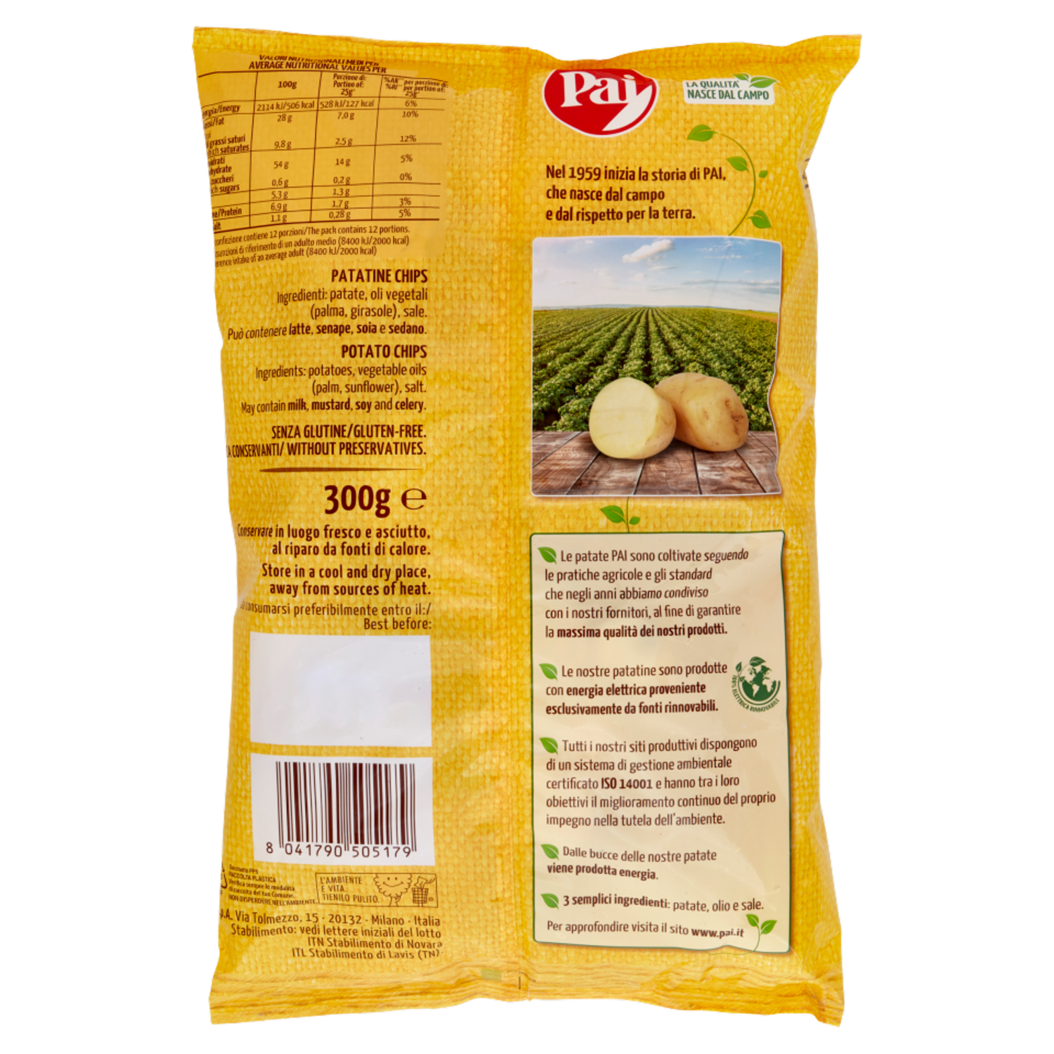 Pai La qualità nasce dal campo Nel 1959 inizia la storia di Pai, che nasce dal campo e dal rispetto per la terra. - Le patate Pai sono coltivate seguendo le pratiche agricole e gli standard che negli anni abbiamo condiviso con i nostri fornitori, al fine di garantire la massima qualità dei nostri prodotti. - Le nostre patatine sono prodotte con energia elettrica proveniente esclusivamente da fonti rinnovabili. 100% Elettrica rinnovabile - Tutti i nostri siti produttivi dispongono di un sistema di gestione ambientale certificato IS0 14001 e hanno tra i loro obiettivi il miglioramento continuo del proprio impegno nella tutela dell'ambiente. - Dalle bucce delle nostre patate viene prodotta energia. - 3 semplici ingredienti: patate, olio e sale. Per approfondire visita il sito www.pai.it
