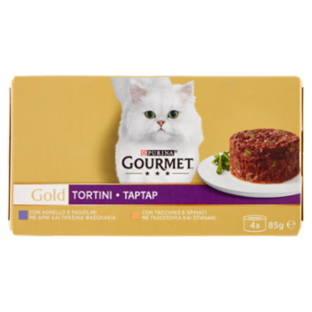 GOURMET Gold Tortini: deliziosi ad ogni boccone. Tutte le ricette. Non contengono coloranti, conservanti e aromi artificiali aggiunti. Sono preparate con ingredienti di qualità. Progettati per essere riciclabili Il cartone e le lattine contenuti all'interno sono progettati per essere riciclabili. Per il corretto smaltimento di questa confezione verifica le disposizioni del tuo Comune Verifica sul nostro sito. purina.eu/packaging - Tortini - Taptap - Con agnello e fagiolini - Con tacchino e spinaci - 4x Lattine 85g ℮