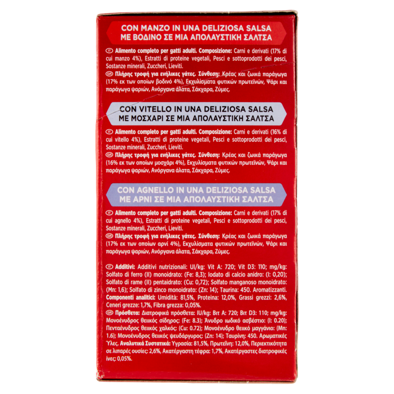 Razione giornaliera e modalità d'uso: per un gatto adulto di circa 4 kg, somministrare dalle 5 alle 6 buste al giorno, preferibilmente in 2 pasti separati. Le razioni medie giornaliere per gatti adulti si basano su gatti con moderata attività fisica in ambienti a temperature normali. Le quantità giornaliere raccomandate dovrebbero essere modificate in base alle esigenze individuali, per mantenere il tuo gatto in una condizione fisica sana e snella. Servire a temperatura ambiente. Lasciare sempre a disposizione acqua fresca e pulita.