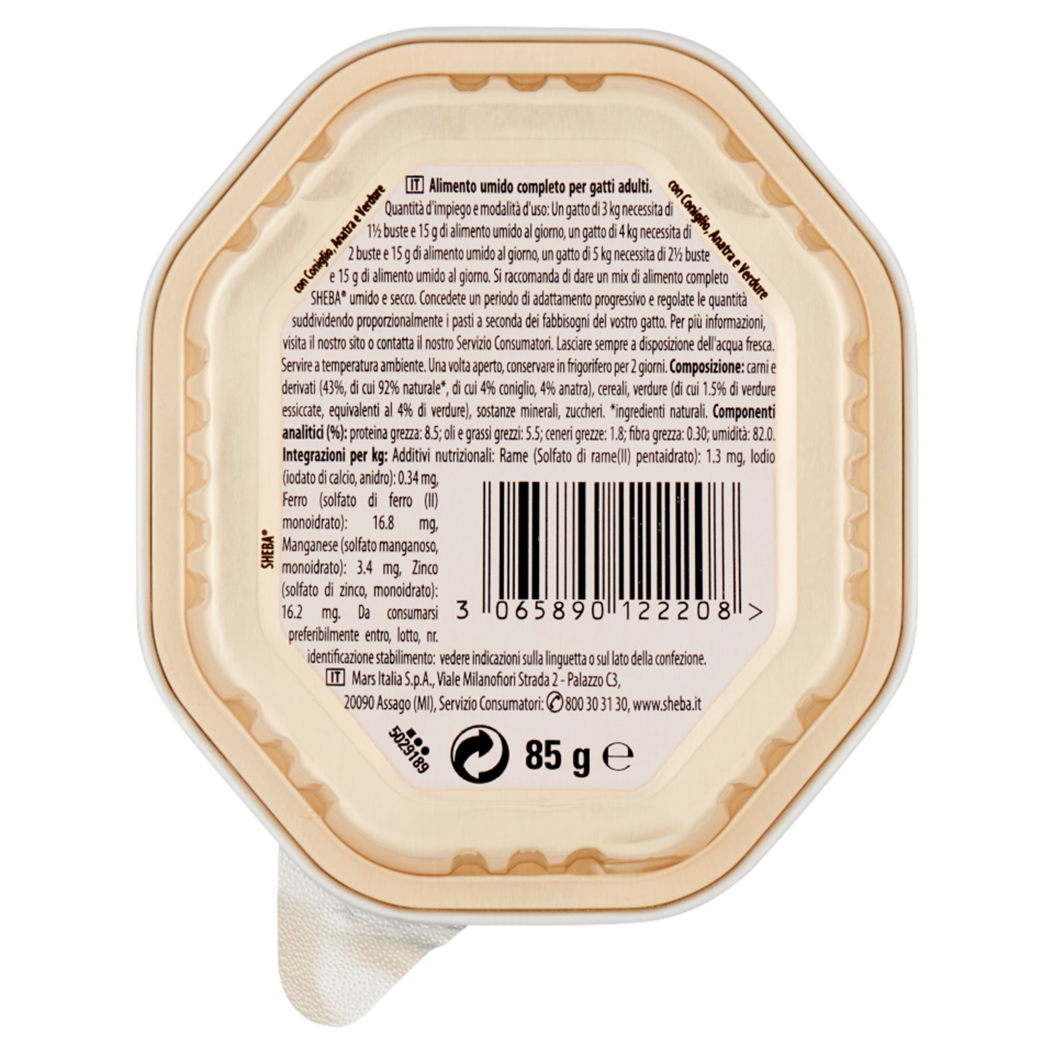 Quantità d'impiego e modalità d'uso: Un gatto di 3 kg necessita di 1 buste e 15 g di alimento umido al giorno, un gatto di 4 kg necessita di 2 buste e 15 g di alimento umido al giorno, un gatto di 5 kg necessita di 2 buste e 15 g di alimento umido al giorno. Si raccomanda di dare un mix di alimento completo Sheba umido e secco. Concedete un periodo di adattamento progressivo e regolate le quantità suddividendo proporzionalmente i pasti a seconda dei fabbisogni del vostro gatto. Per più informazioni, visita il nostro sito o contatta il nostro Servizio Consumatori. Lasciare sempre a disposizione dell'acqua fresca. Servire a temperatura ambiente. Una volta aperto, conservare in frigorifero per 2 giorni. 75 kcal / 85 g