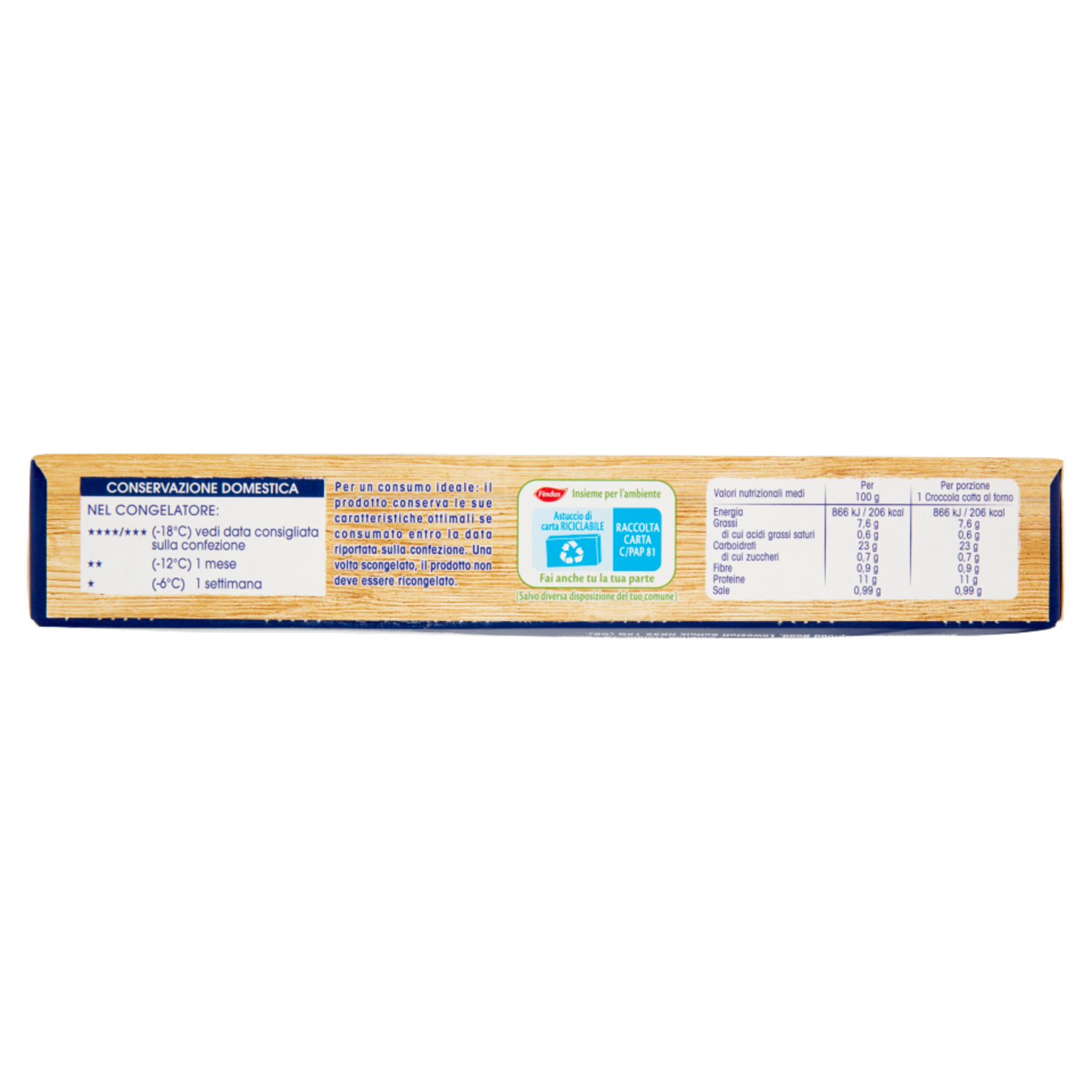 Conservazione domestica Nel congelatore: ****/*** (-18°C) vedi data consigliata sulla confezione ** (-12°C) 1 mese * (-6°C) 1 settimana Per un consumo ideale: il prodotto conserva le sue caratteristiche ottimali se consumato entro la data riportata sulla confezione. Una volta scongelato, il prodotto non deve essere ricongelato.
