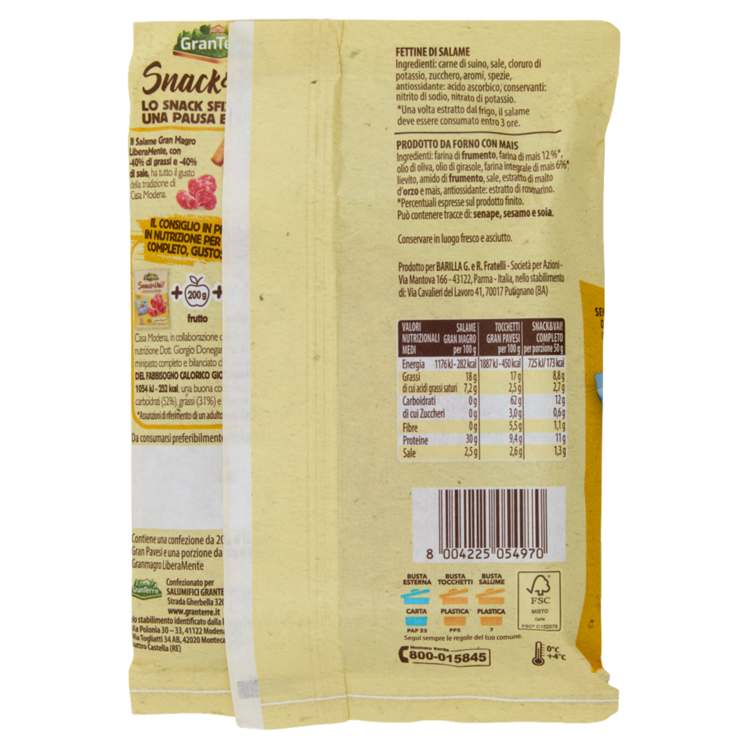Contiene una confezione da 20 g di Tocchetti Gran Pavesi e una porzione da 30g di Salame Granmagro LiberaMente