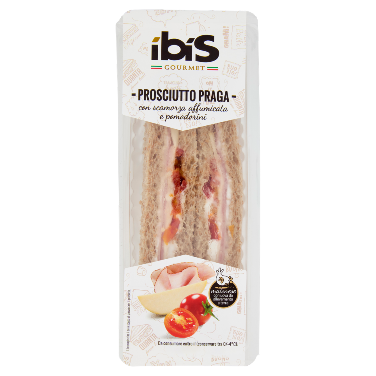 Due tramezzini Gourmet di pane alla farina integrale farciti con prosciutto Praga, scamorza affumicata, pomodorini e maionese
