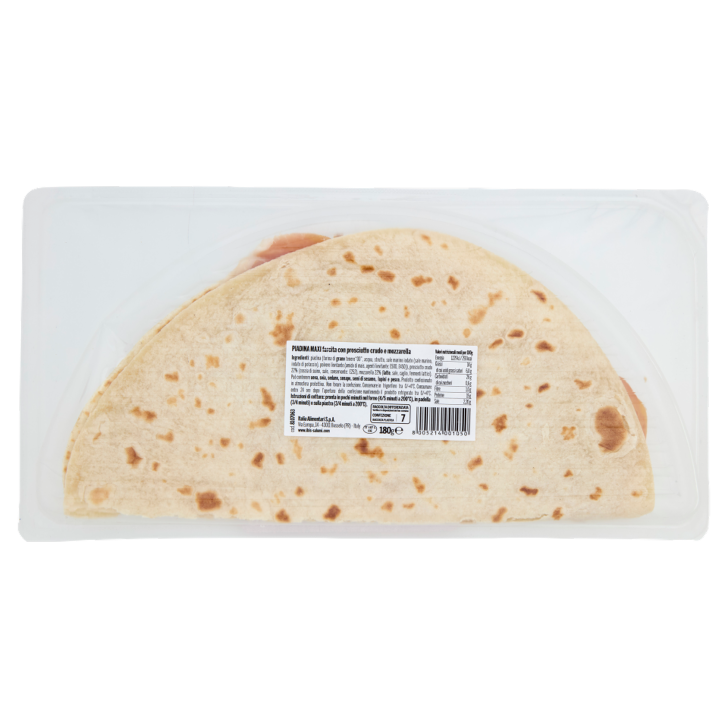 Piadina (farina di grano tenero tipo "00", acqua, strutto, sale, agenti lievitanti: E450i, E550ii, amido di mais, zucchero)