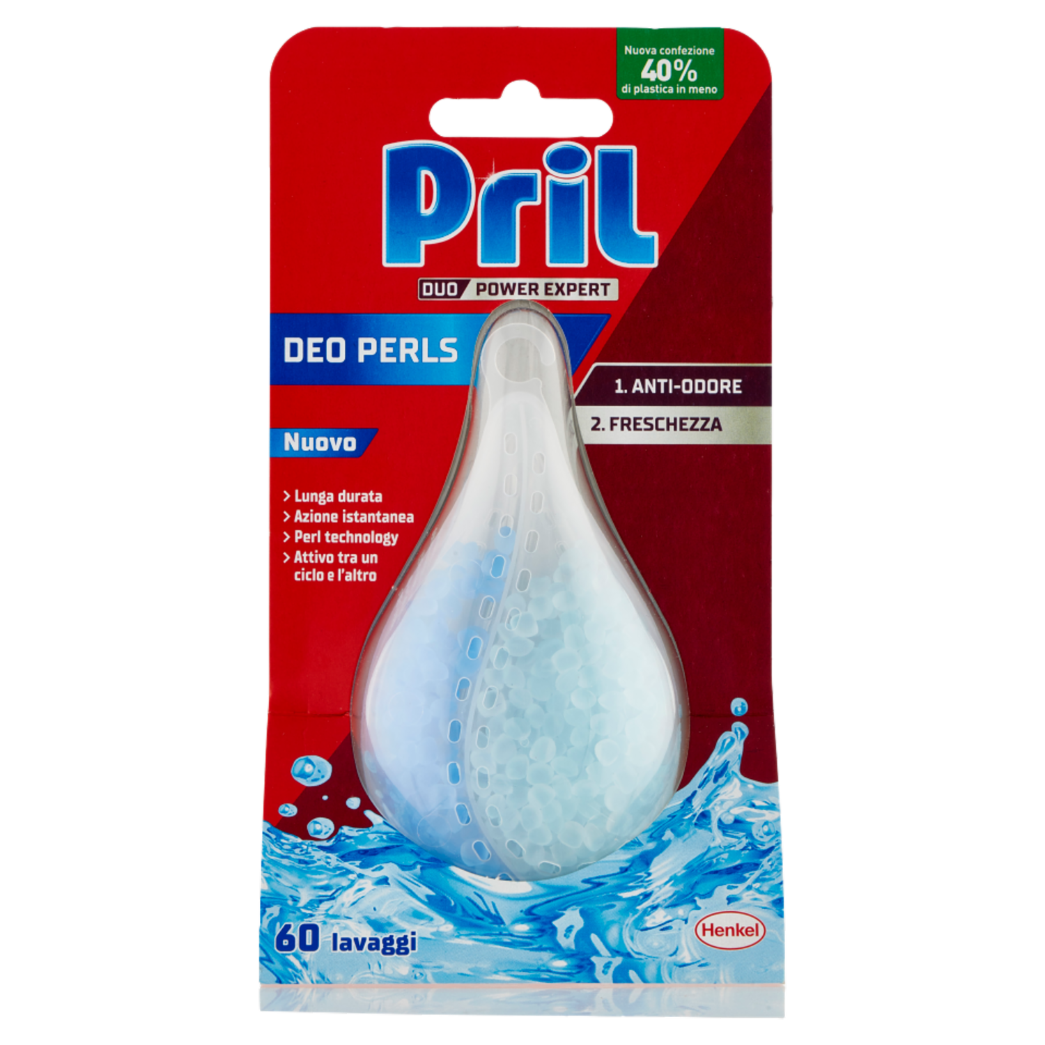 Pril Deo Perls, grazie al suo design a doppia camera, sprigiona costantemente una fresca fragranza agrumata e un profumo di pulito. Agisce fino a 60 lavaggi. - Lunga durata - Azione istantanea - Perl technology - Attivo tra un ciclo e l'altro