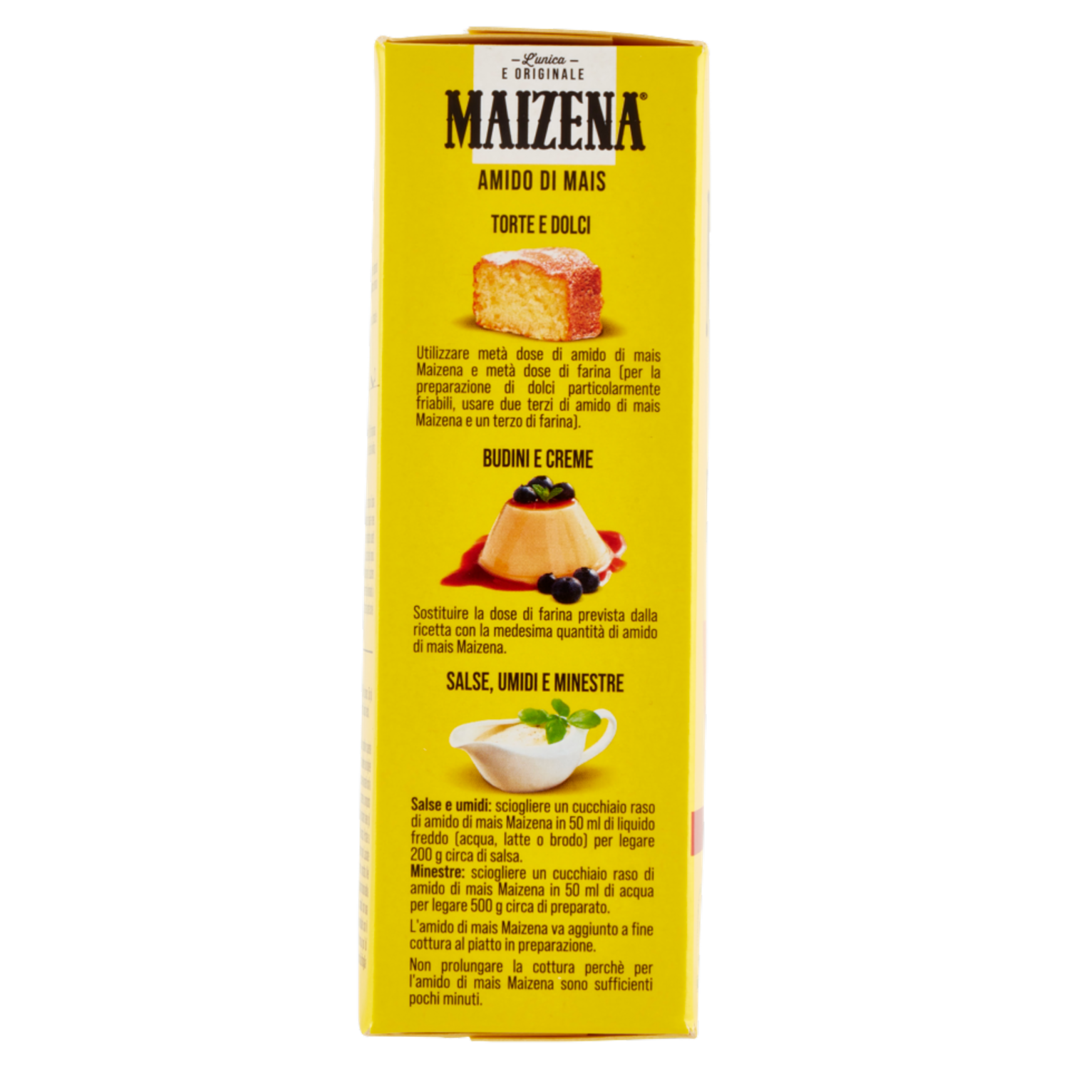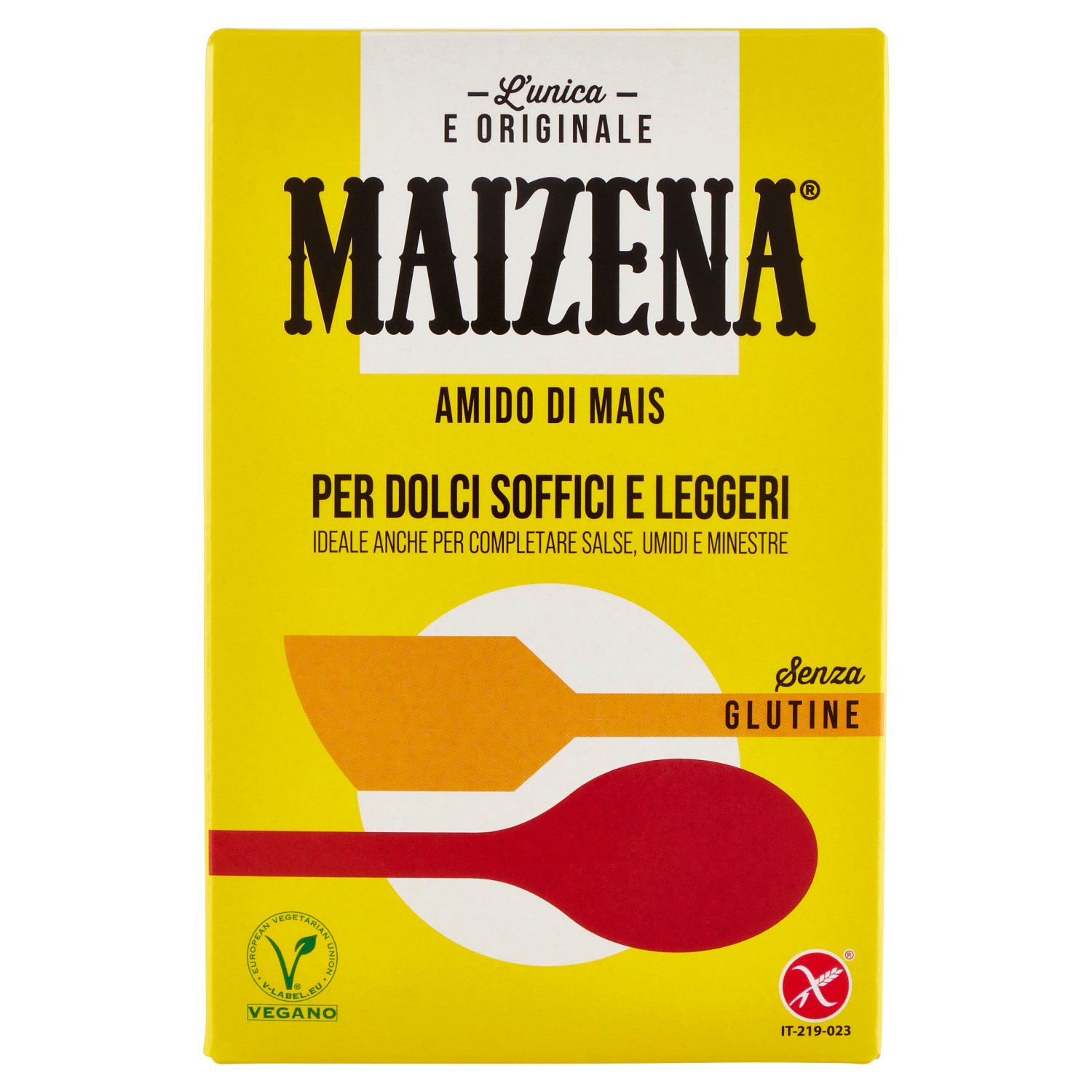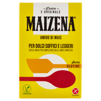 L'amido di mais è un ingrediente prezioso per conferire sofficità e leggerezza ai tuoi dolci. I dolci preparati con l'amido di mais Maizena acquistano, oltre ad una soffice consistenza, un gusto molto delicato, che non è possibile ottenere con il solo uso di altre farine*. L'amido di mais Maizena è un ingrediente ideale anche per addensare in pochi minuti salse, umidi, brasati e minestre; il suo gusto neutro, infatti, non copre il sapore caratteristico dei cibi. Per un dosaggio più facile: 1 cucchiaio raso di Maizena corrisponde a 10g di prodotto. * per ricette senza glutine utilizzare farine senza glutine