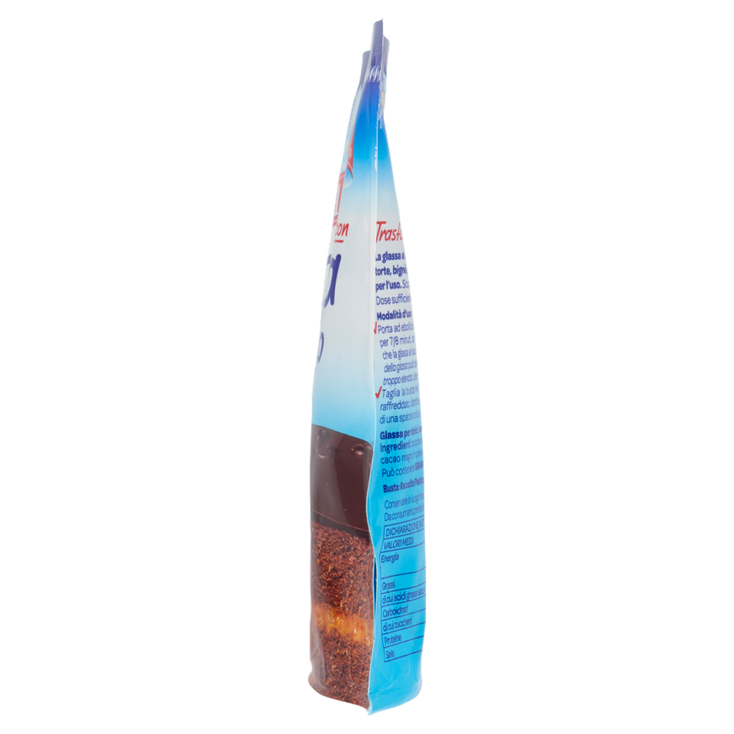 Dose sufficiente per ricoprire una torta di diametro di 26cm. Modalità d'uso - Portare ad ebollizione dell'acqua in un pentolino, spegnere ed immergervi la busta per 7/8 minuti, quindi asciugarla e manipolarla per qualche secondo, in modo che la glassa al suo interno si sciolga in modo uniforme. Attenzione: la qualità della glassa può alterarsi se la si scalda troppo a lungo e a una temperatura troppo elevata. Una volta aperta la confezione non può più essere scaldata. - Tagliare la busta nell'angolo superiore e versare subito la glassa sul dolce raffreddato, distribuendola rapidamente sulla superficie e ai bordi con l'aiuto di una spatola o di un coltello. Lasciare raffreddare a temperatura ambiente.