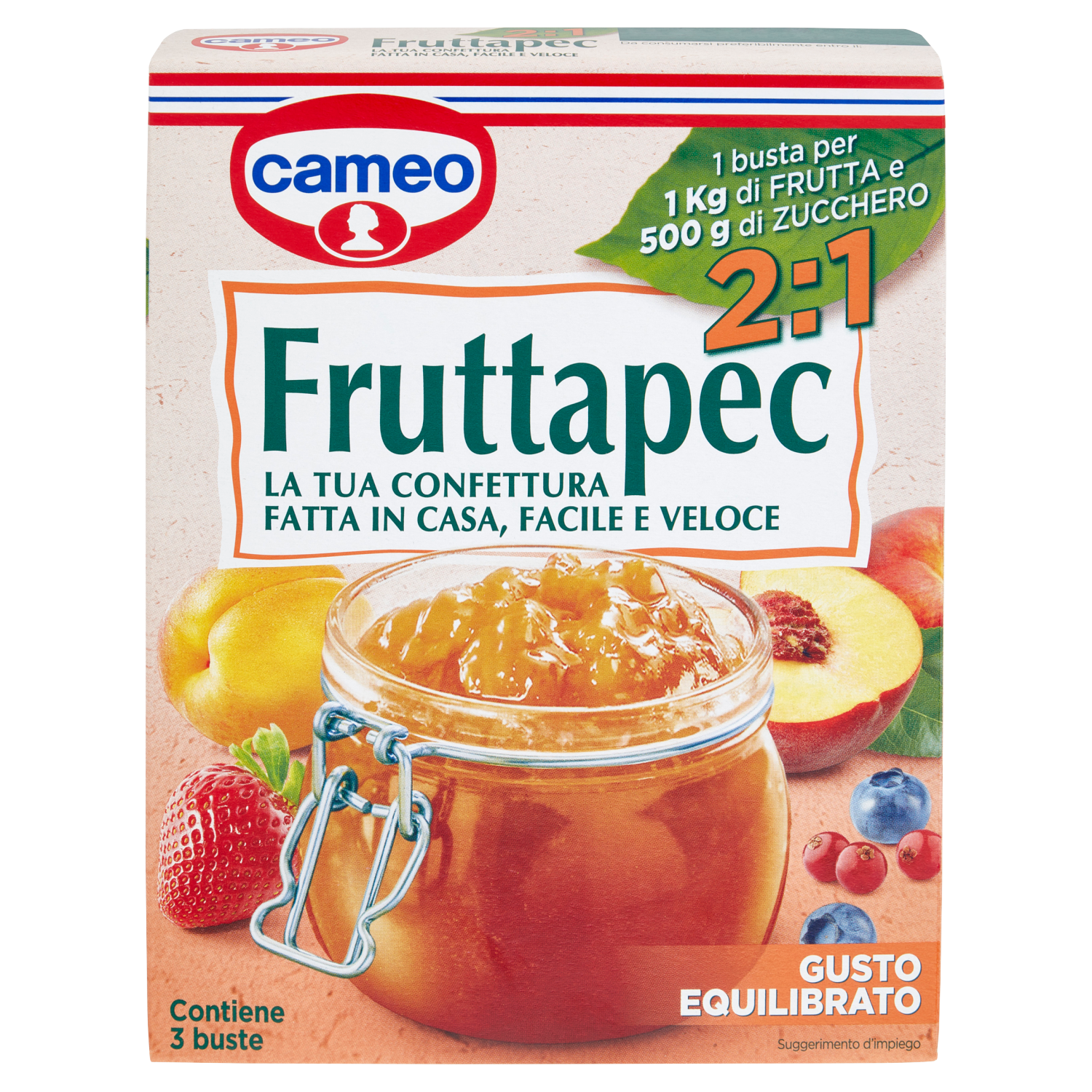 1 Lava, monda, taglia la frutta a pezzetti piccoli e mettila in una pentola alta. 2 Mescola il Fruttapec 2:1 con lo zucchero e aggiungilo a freddo alla frutta. 3 Porta ad ebollizione e fai bollire la frutta per 3 minuti, a fiamma molto alta, sempre mescolando. 4 Togli la pentola dal fuoco e mescola ancora per un minuto facendo dissolvere la schiuma. 5 Valuta la consistenza della confettura, quindi versala ancora bollente in vasetti sterilizzati, chiudi e capovolgi per circa 5 minuti. Conserva il vasetto in frigorifero dopo l'apertura. La tua confettura è pronta! Si raccomanda la cottura di al massimo 2 kg di frutta alla volta Ideale per tutti i tipi di frutta tranne banane, castagne, limoni, melone e anguria.