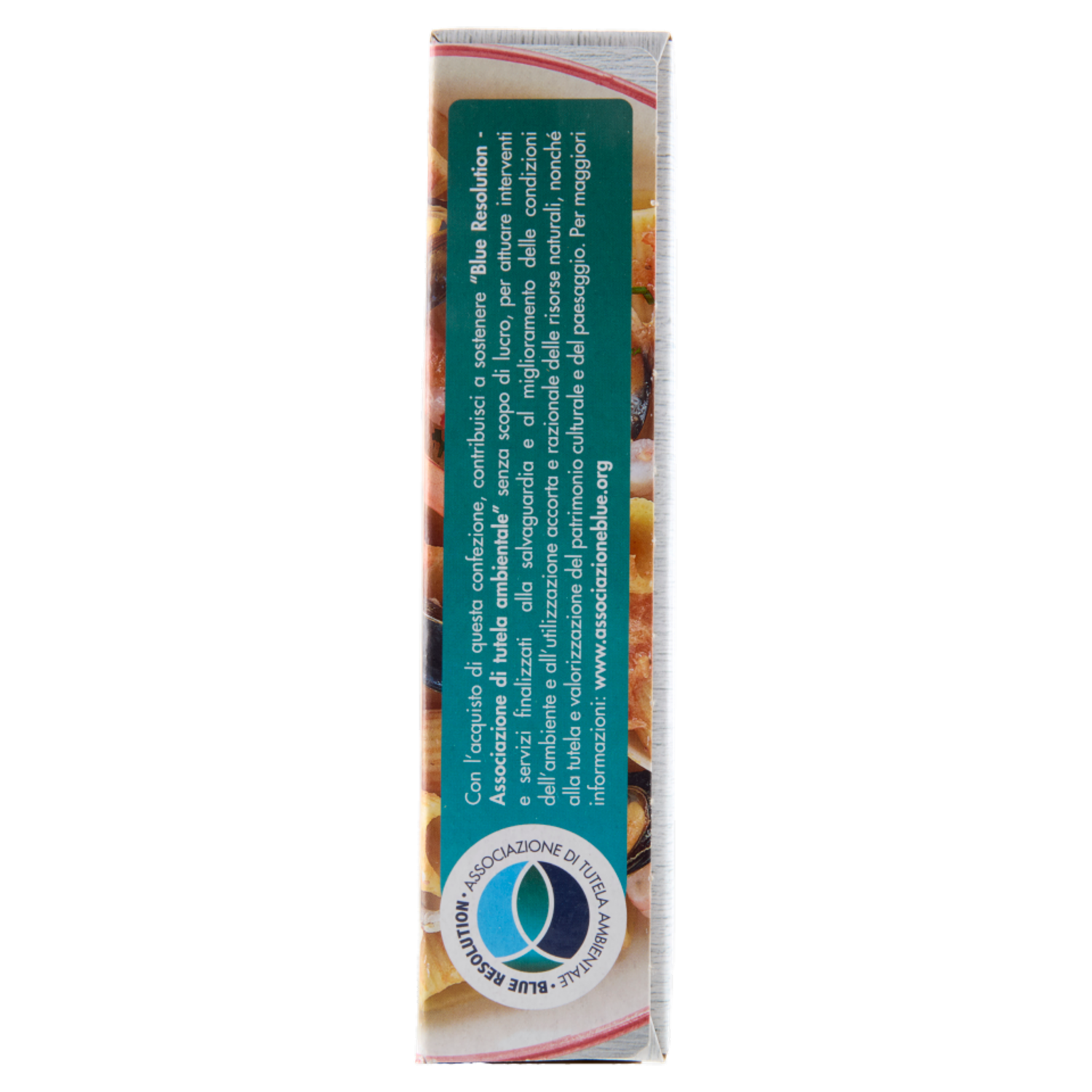 Mix di molluschi e crostacei 49% (cozze con guscio, vongole con guscio, gamberi sgusciati (gambero, antiossidante: metabisolfito di sodio)(1*) o mazzancolle sgusciate (mazzancolle, antiossidante: metabisolfito di sodio)(2*), code di gamberone (gamberone, antiossidante: metabisolfito di sodio) (3*) o code di mazzancolle (mazzancolle, antiossidante: metabisolfito di sodio(4*))