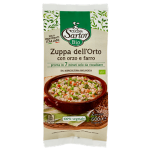 Zuppa dell'orto con orzo e farro surgelata biologico Preparazione alimentare a base di ortaggi e cereali, surgelata