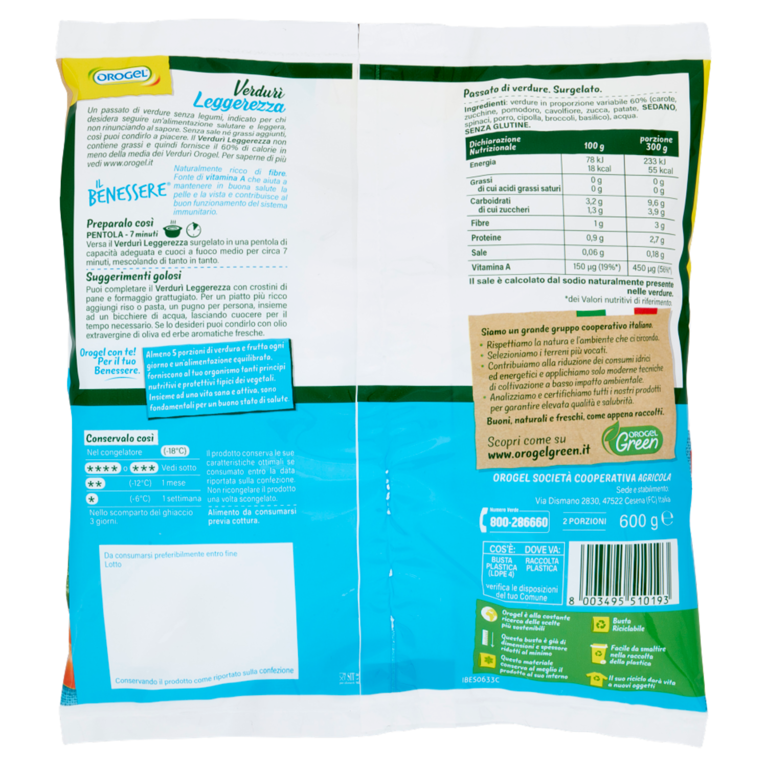 Un passato di verdure senza legumi, indicato per chi desidera seguire un'alimentazione salutare e leggera, non rinunciando al sapore. Senza sale né grassi aggiunti, così puoi condirlo a piacere. Il Verdurì Leggerezza non contiene grassi e quindi fornisce il 60% di calorie in meno della media dei Verdurì Orogel. Per saperne di più vedi www.orogel.it Naturalmente ricco di fibre. Fonte di vitamina A che aiuta a mantenere in buona salute la pelle e la vista e contribuisce al buon funzionamento del sistema immunitario. Orogel con te! Per il tuo benessere. Almeno 5 porzioni di verdura e frutta ogni giorno e un'alimentazione equilibrata, forniscono al tuo organismo tanti principi nutritivi e protettivi tipici dei vegetali. Insieme ad una vita sana e attiva, sono fondamentali per un buono stato di salute. Orogel è alla costante ricerca delle scelte più sostenibili Questa busta è già di dimensioni e spessore ridotti al minimo Questo materiale conserva al meglio il prodotto al suo interno Busta Riciclabile Facile da smaltire nella raccolta della plastica Il suo riciclo darà vita a nuovi oggetti