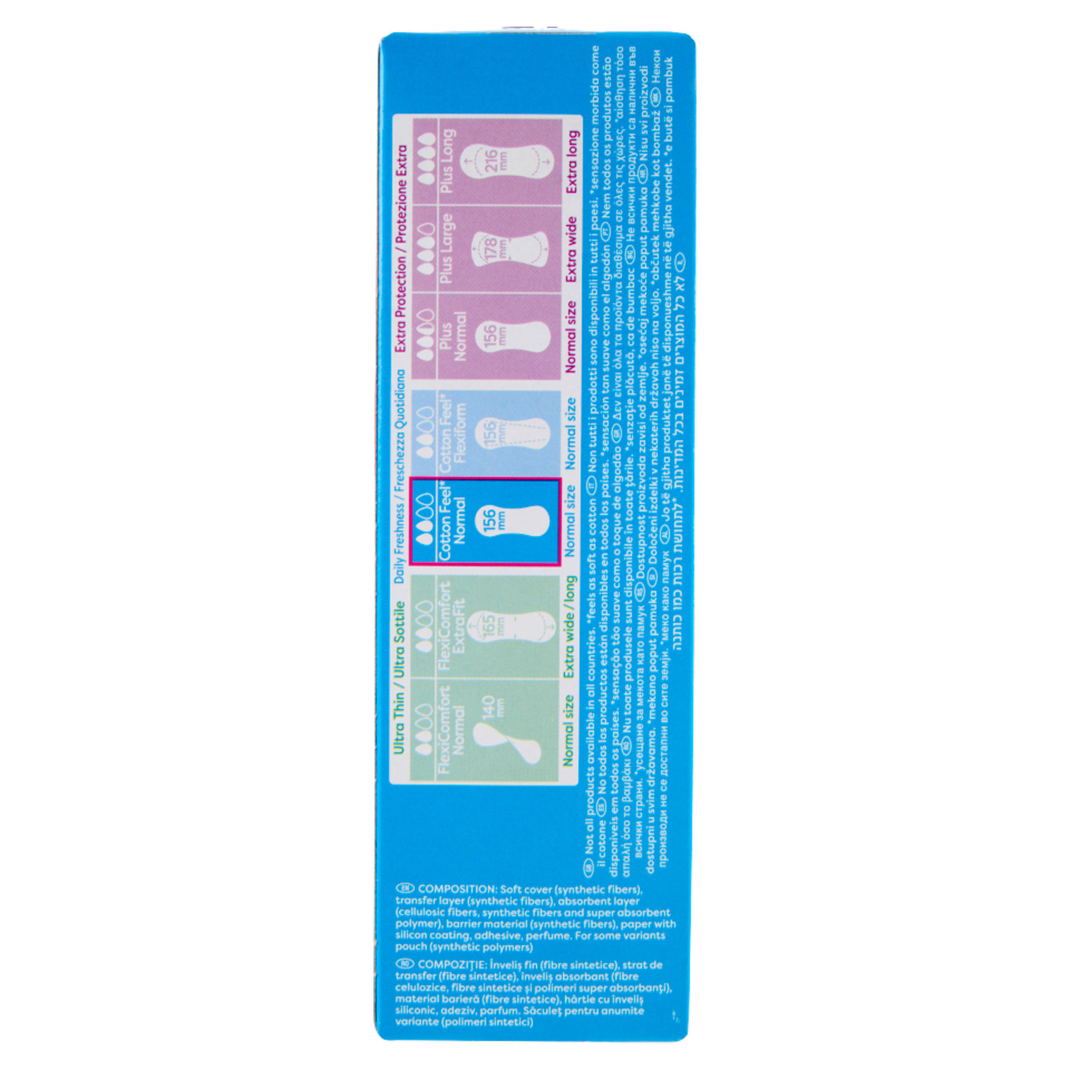 Ultra Sottile Assorbenza 2 su 4 - FlexiComfort Normal 140 mm Normal size Assorbenza 2 su 4 - FlexiComfort ExtraFit 165 mm Extra wide / long Freschezza Quotidiana Assorbenza 2 su 4 - Cotton Feel* Normal 156 mm Normal size Assorbenza 2 su 4 - Cotton Feel* Flexiform 156 mm Normal size Protezione Extra Assorbenza 2,5 su 4 - Plus Normal 156 mm Normal size Assorbenza 3 su 4 - Plus Large 178 mm Extra wide Assorbenza 4 su 4 - Plus Long 216 mm Extra long Non tutti i prodotti sono disponibili in tutti i paesi. *sensazione morbida come il cotone