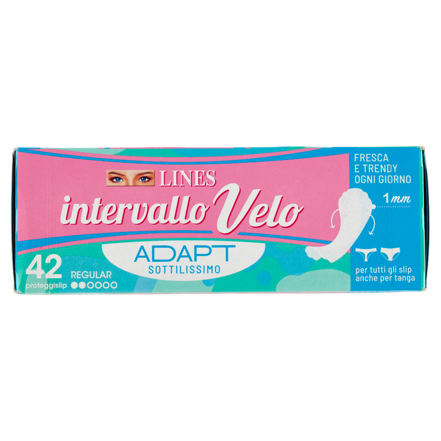Fresco pulito ogni giorno. Sottilissimo. Intervallo Velo è il proteggislip ipoallergenico sottile e flessibile che si adatta come un velo sul tuo slip. In più, il sistema "Odor Protection" neutralizza gli odori, per farti sentire sicura e fresca ogni giorno. Sottilissimo - 1 mm di Spessore Per tutti i tipi di slip Odor protection Filtrante traspirante