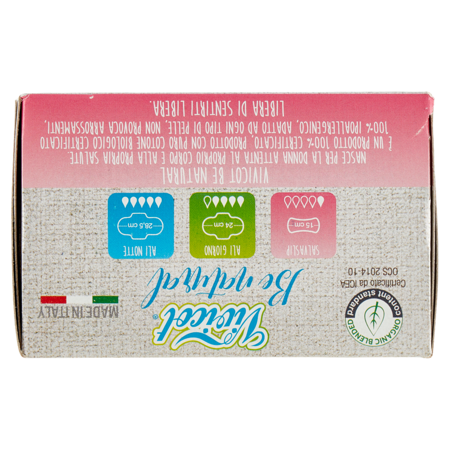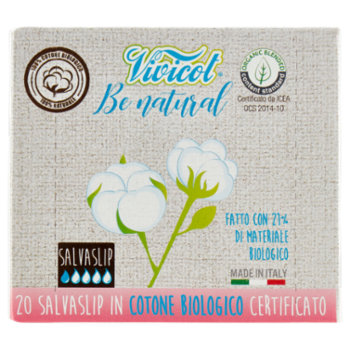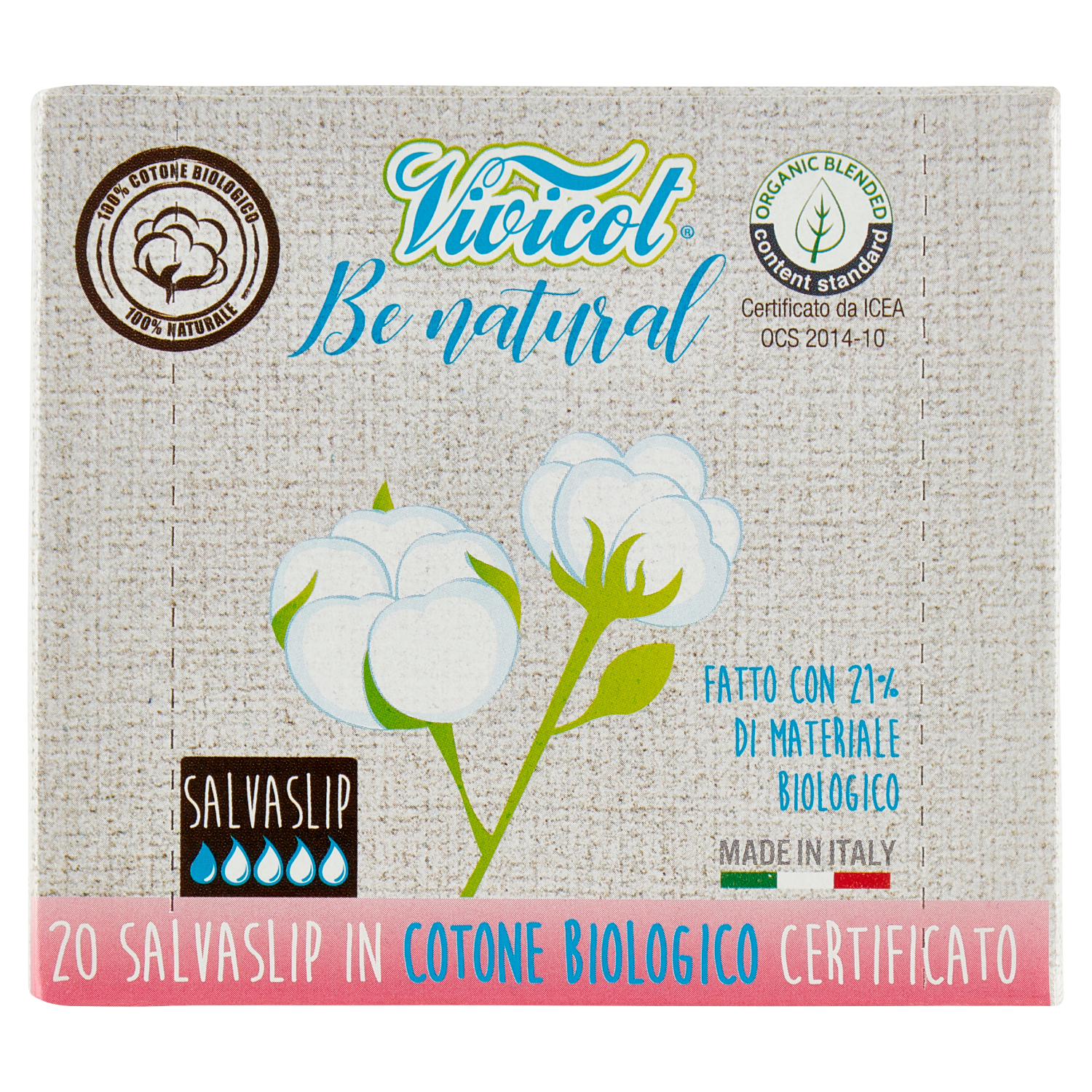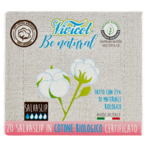 Vivicot Be natural Nasce per la donna attenta al proprio corpo e alla propria salute. È un prodotto 100% certificato, prodotto con puro cotone biologico certificato 100% ipoallergenico, adatto ad ogni tipo di pelle, non provoca arrossamenti, libera di sentirti libera. Prova tutti i prodotti della linea Vivicot Be natural: Vivicot ali notte, Vivicot salvaslip ripiegati. La linea 100% certificata con cotone biologico certificato. Salvaslip - 15 cm - Assorbenza 1 su 5 Ali giorno - 24 cm - Assorbenza 4 su 5 Ali notte - 28,5 cm - Assorbenza 5 su 5