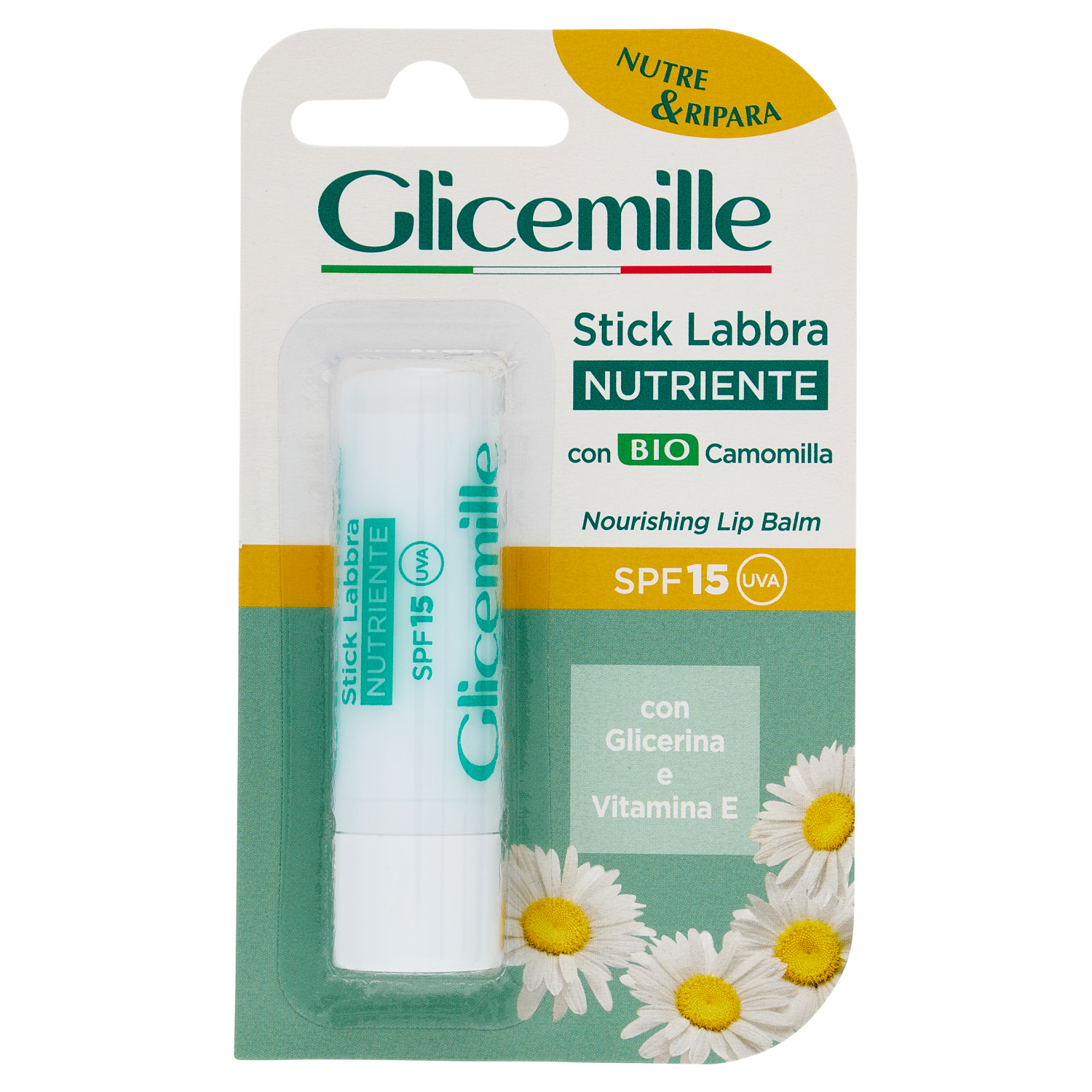 Lo Stick Glicemille, con formula a base naturale, nutre intensamente le labbra proteggendole in ogni stagione da sole, vento e freddo. Svolge un'azione preventiva e riparatrice contro screpolature e disidratazione. I Filtri Solari con SPF15 aiutano a proteggere le labbra dagli effetti dannosi dei raggi UVA e UVB. La formula, arricchita con Glicerina Vegetale, Estratto Biologico di Camomilla e Vitamina E, dona nutrimento alle labbra rendendole lisce e morbide. Texture vellutata. Dermatologicamente testato su pelli sensibili. Formulato senza derivati del petrolio