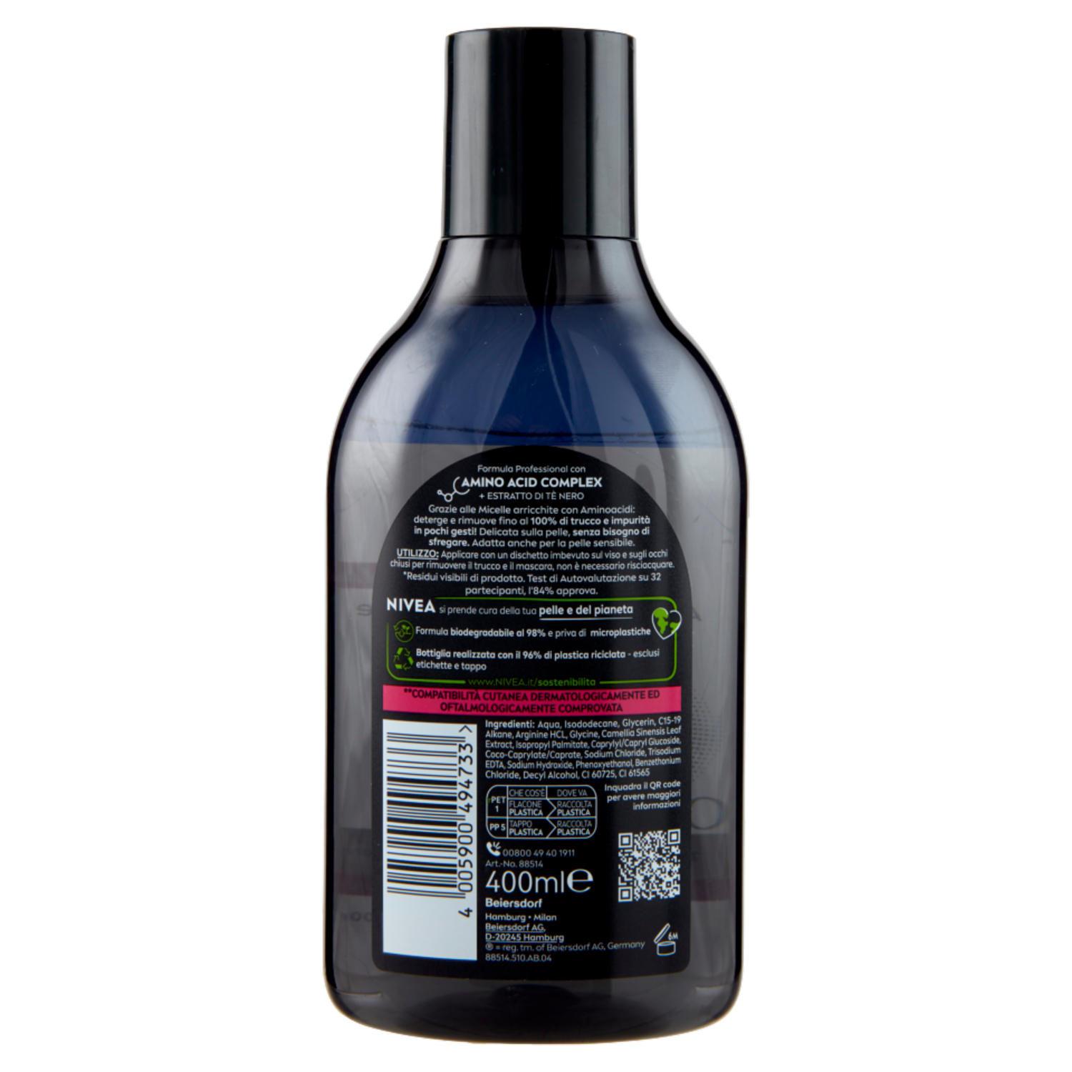 Formula Professional con Amino Acid Complex + Estratto di Tè Nero Grazie alle Micelle arricchite con Aminoacidi: deterge e rimuove fino al 100% di trucco e impurità in pochi gesti! Delicata sulla pelle, senza bisogno di sfregare. Adatta anche per la pelle sensibile. Nivea si prende cura della tua pelle e del pianeta - Formula biodegradabile al 98% e priva di microplastiche - Bottiglia realizzata con il 96% di plastica riciclata - esclusi etichette e tappo www.nivea.it/sostenibilita